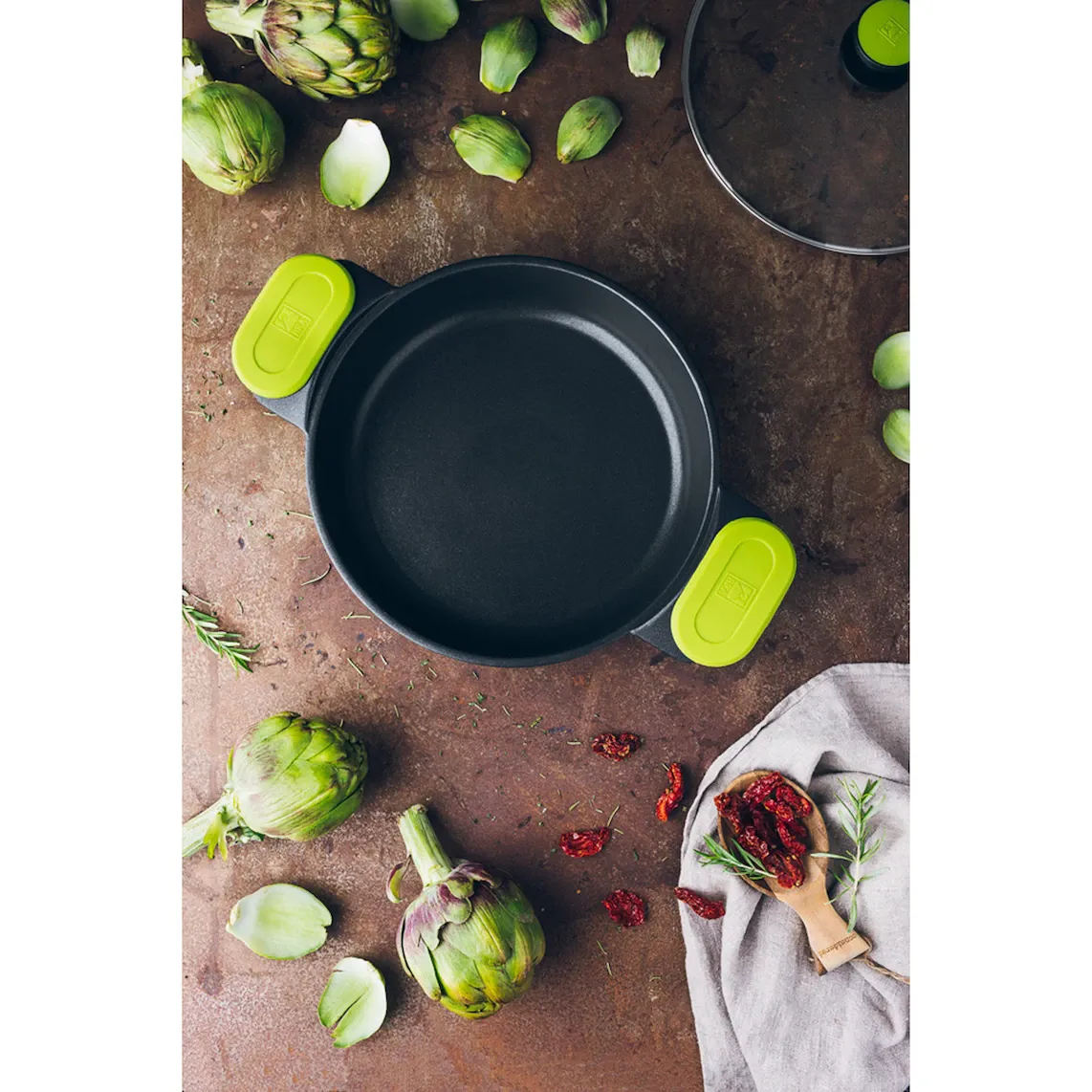 Низкая кастрюля Foodie от Bra подходит для всех типов плит, включая индукционные, и сочетает в себе лучшее качество с современным и неподвластным времени дизайном черного цвета с цветными вставками на ручках.