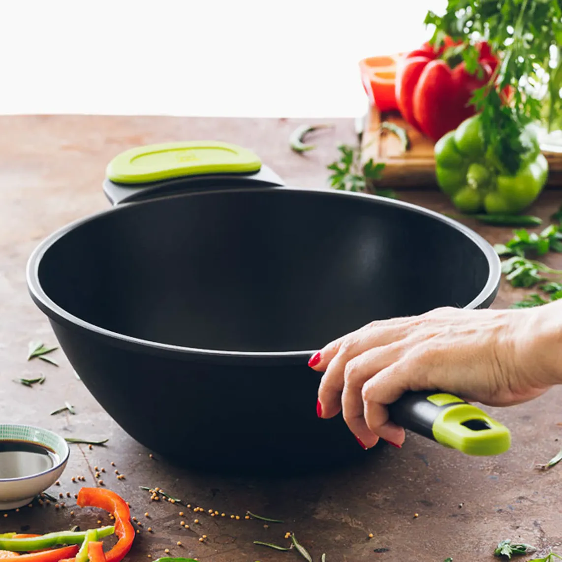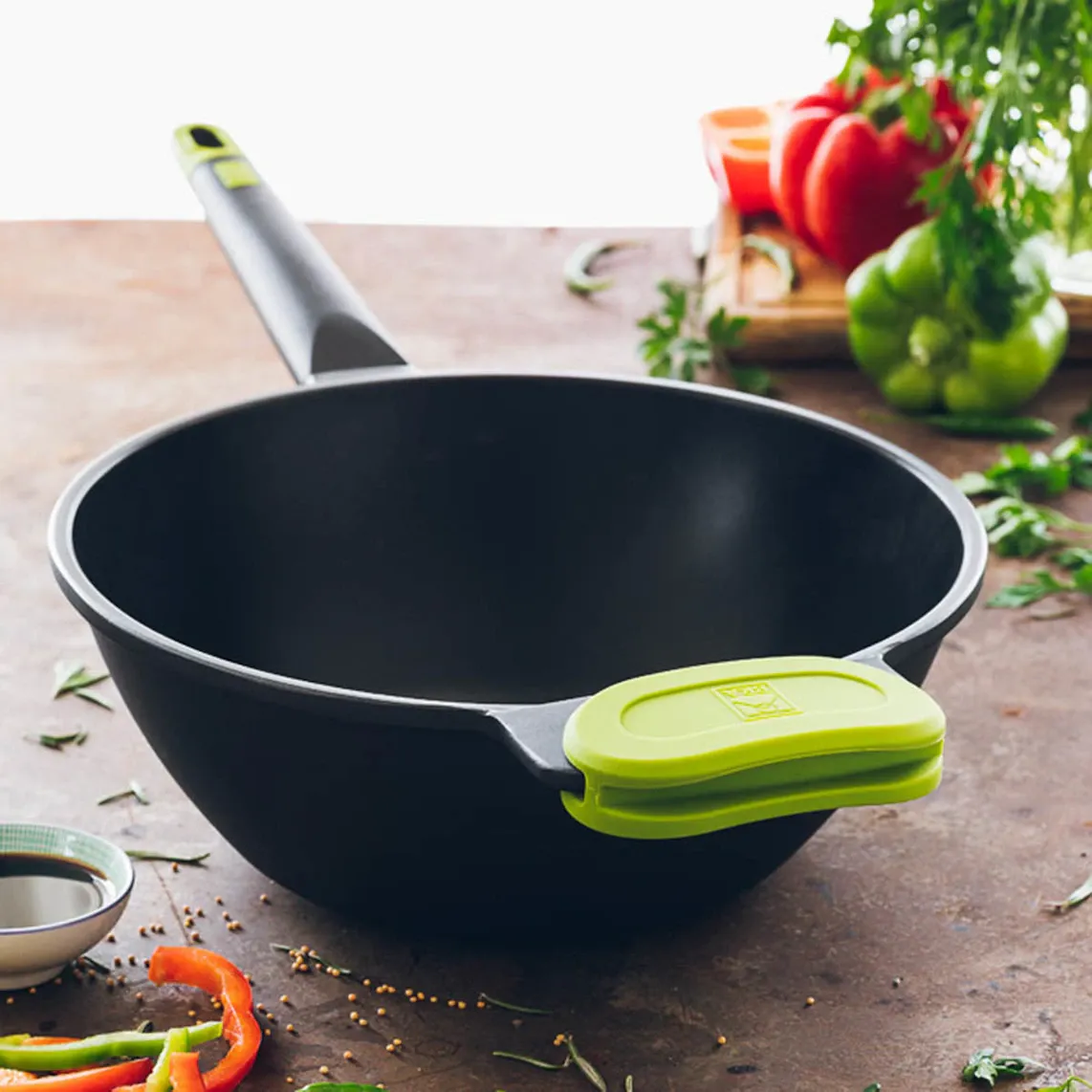 С воком серии Bra Foodie вы сможете готовить вкусные блюда удобным и простым способом. Он подходит для всех типов плит, включая индукционные, и сочетает в себе лучшее качество с современным и неподвластным времени дизайном черного цвета с цветными вставками на ручке.