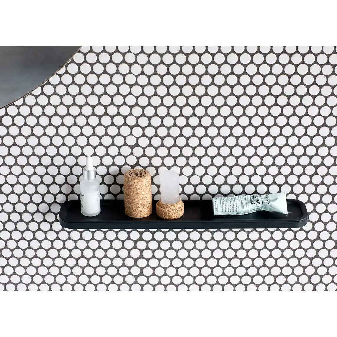 Полка для ванной комнаты, на которой достаточно места для чаши для зубной щетки, баночек для хранения или контейнера для мусора, но при этом достаточно маленькая, чтобы ее можно было повесить над ванной или раковиной.