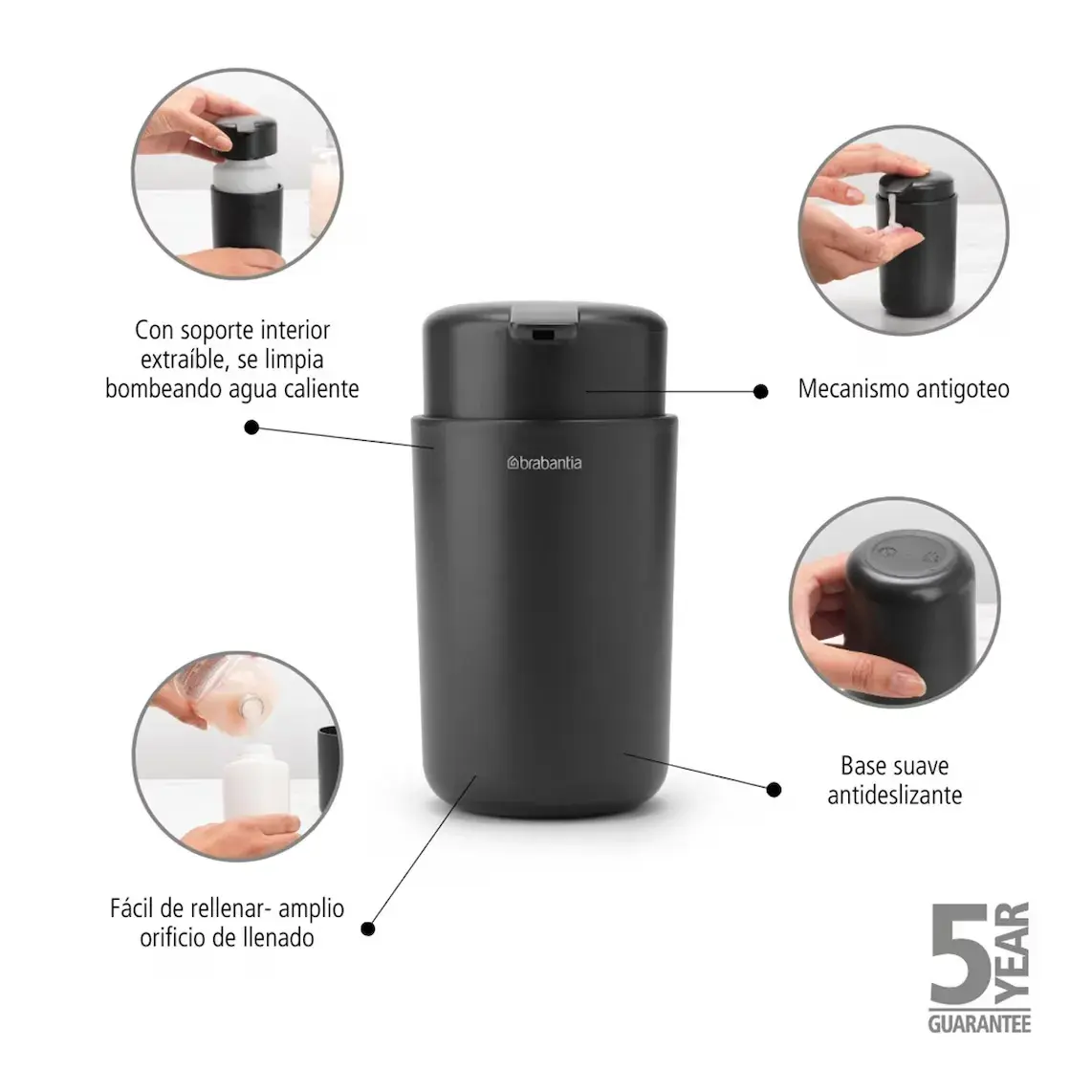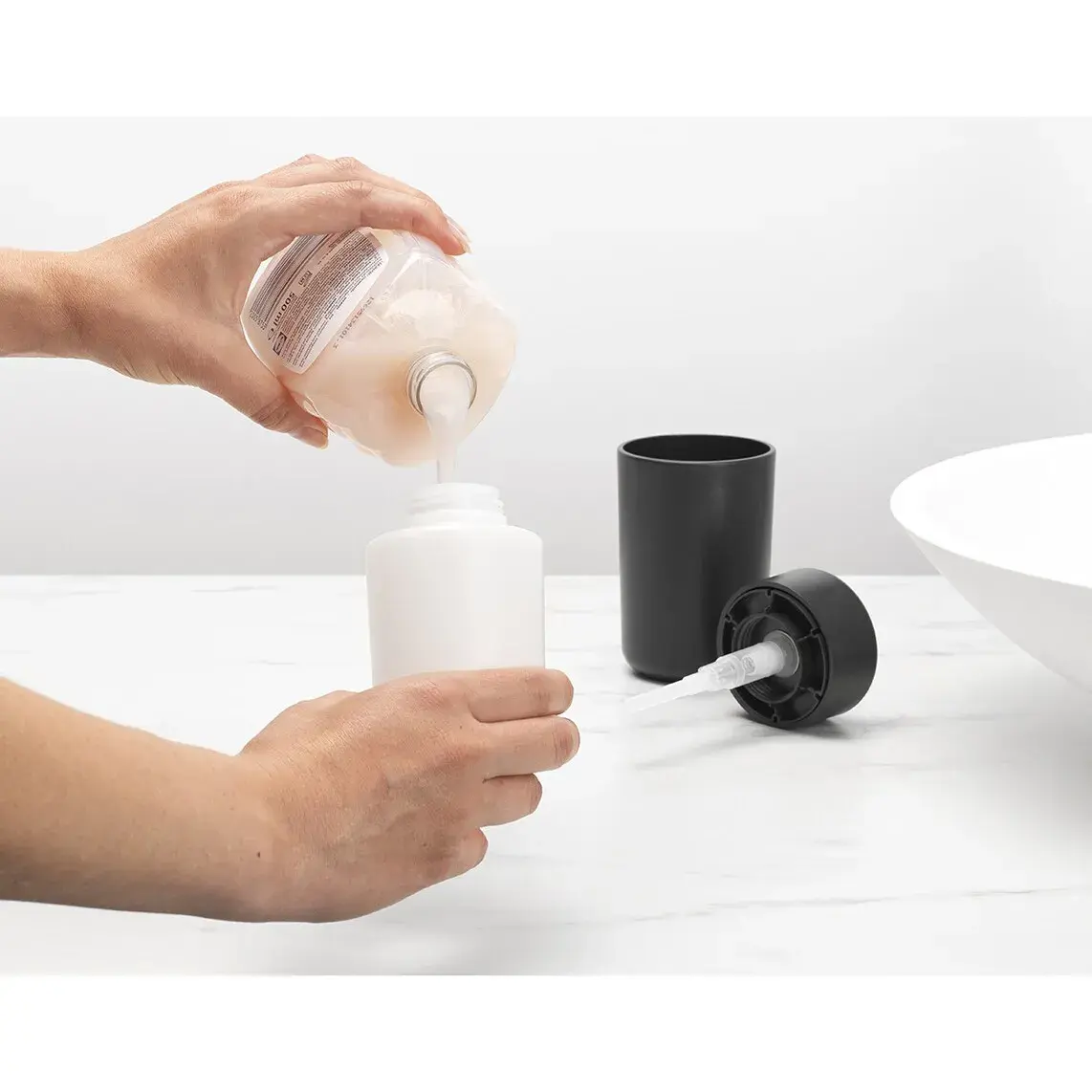 Дозатор для мыла емкостью 250 мл. Он имеет нескользящее дно и большое отверстие для удобного наполнения.