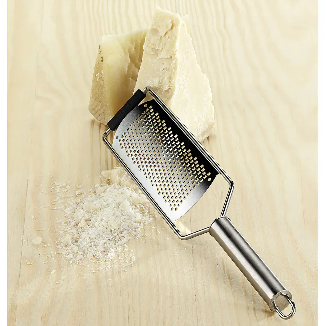 Мелкая терка с ручкой и нержавеющей сталью. Его прямоугольная форма с режущей поверхностью и основанием для поддержки очень удобна для натирания различных продуктов, таких как сыр или цедра цитрусовых, на мелкие волокна.