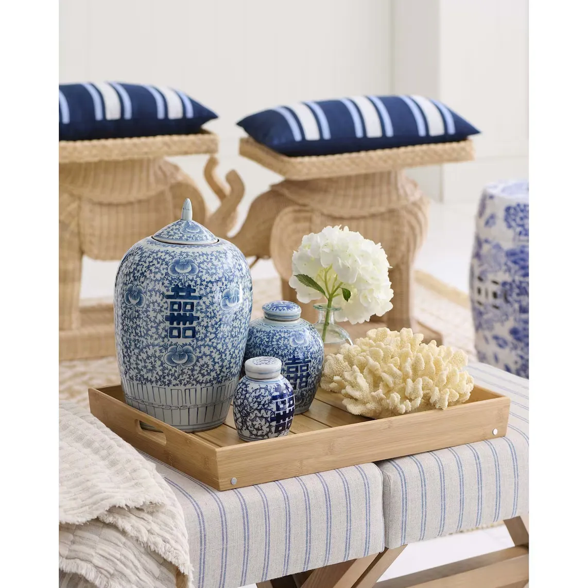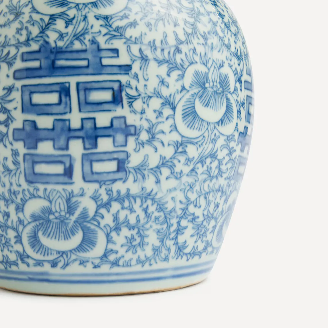 Тибор изготовлен из фарфора и расписан вручную резьбой из листьев, образующих оригинальный растительный рисунок. Тандем белого и синего придает ему завершающий штрих элегантности и изысканности, идеально подходящий для любого уголка.