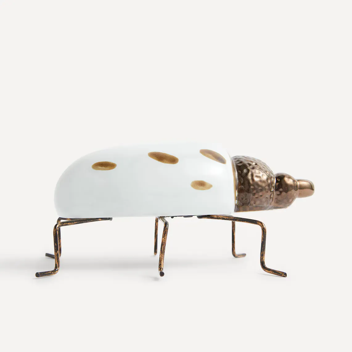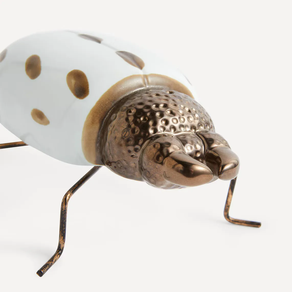 Декоративная фигурка в виде жука из полированного, расписанного вручную и эмалированного фарфора, с металлическими ножками и усиками. Он придаст веселый и красочный вид небольшим углам и полкам.