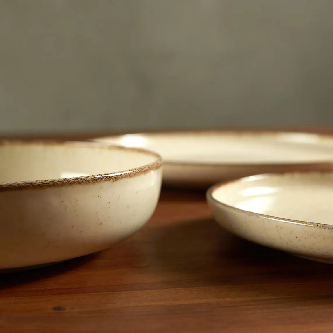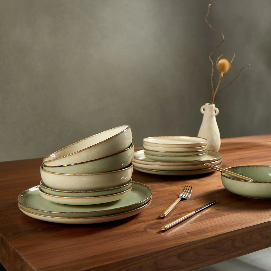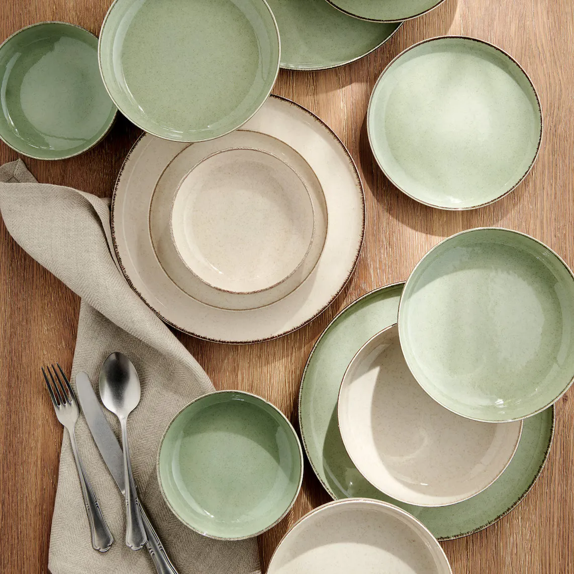 Посуда на 4 персоны, состоящая из четырех обеденных тарелок, 4 глубоких тарелок и 4 десертных тарелок. Он выделяется своей простотой и изготовлением из фарфора с реактивной глазурью, что делает его идеальным для ежедневного использования.