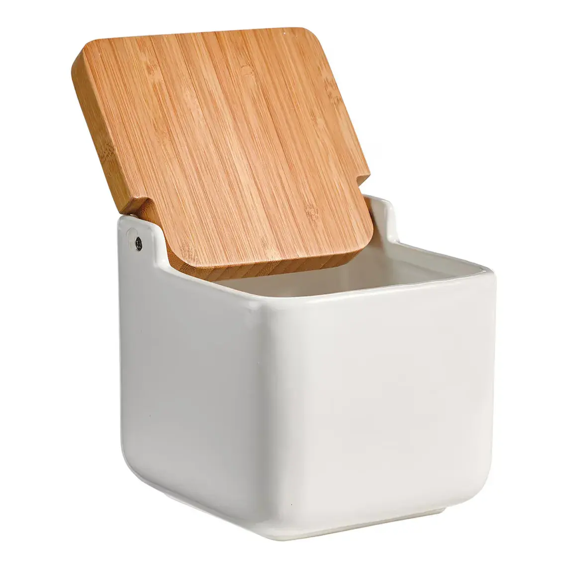 Белая керамическая солонка для стола или столешницы в форме коробки с деревянной крышкой из бамбука. Элегантный классический стиль, который добавит изюминку вашей кухне.