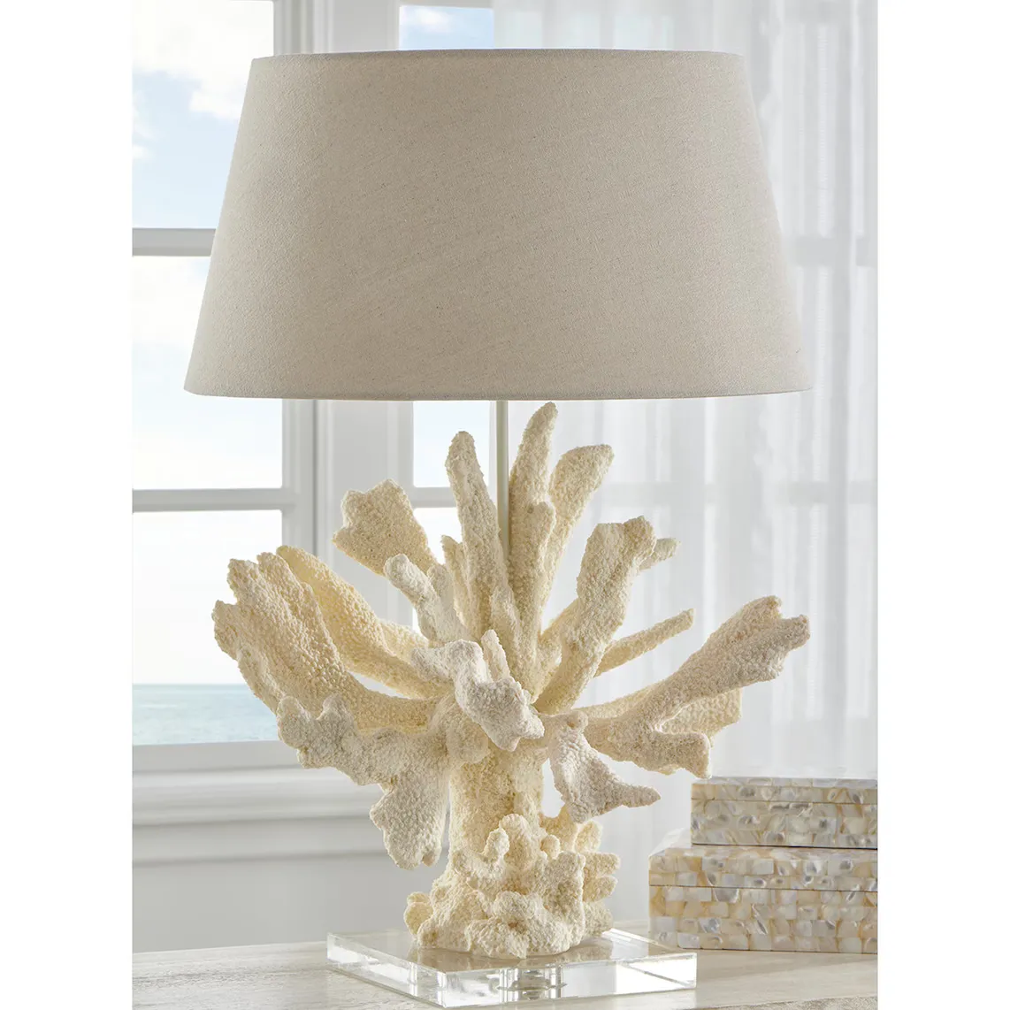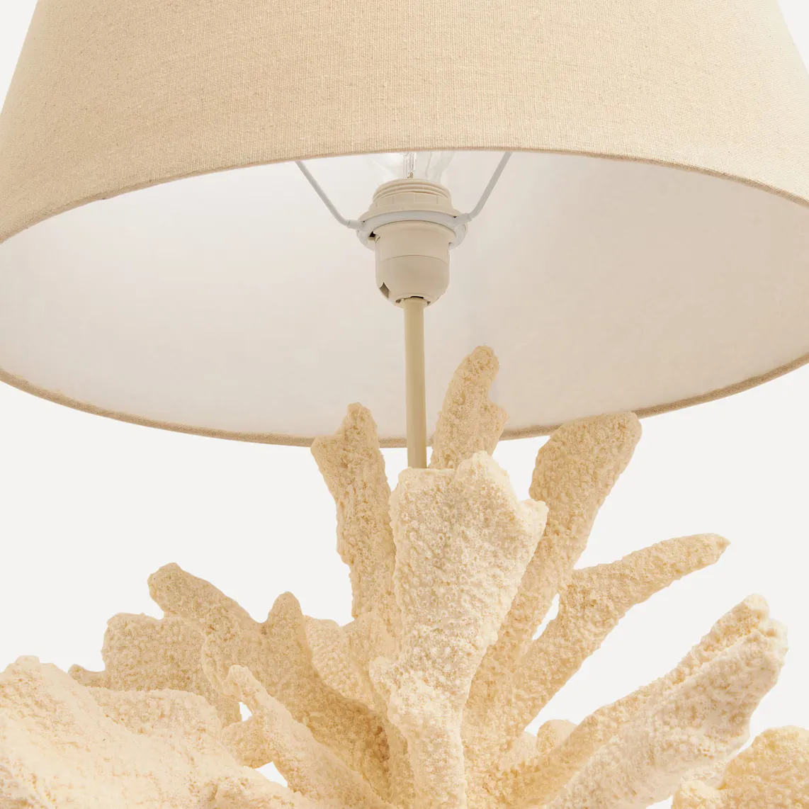 Настольная лампа с основанием из смолы в форме коралла и текстильным абажуром. Выберите лампочку, цвет и количество света которой лучше всего подходят для вашего дома. Совместим с лампами с толстым цоколем E27 и максимальной мощностью 60 Вт. Лампа в комплект не входит.