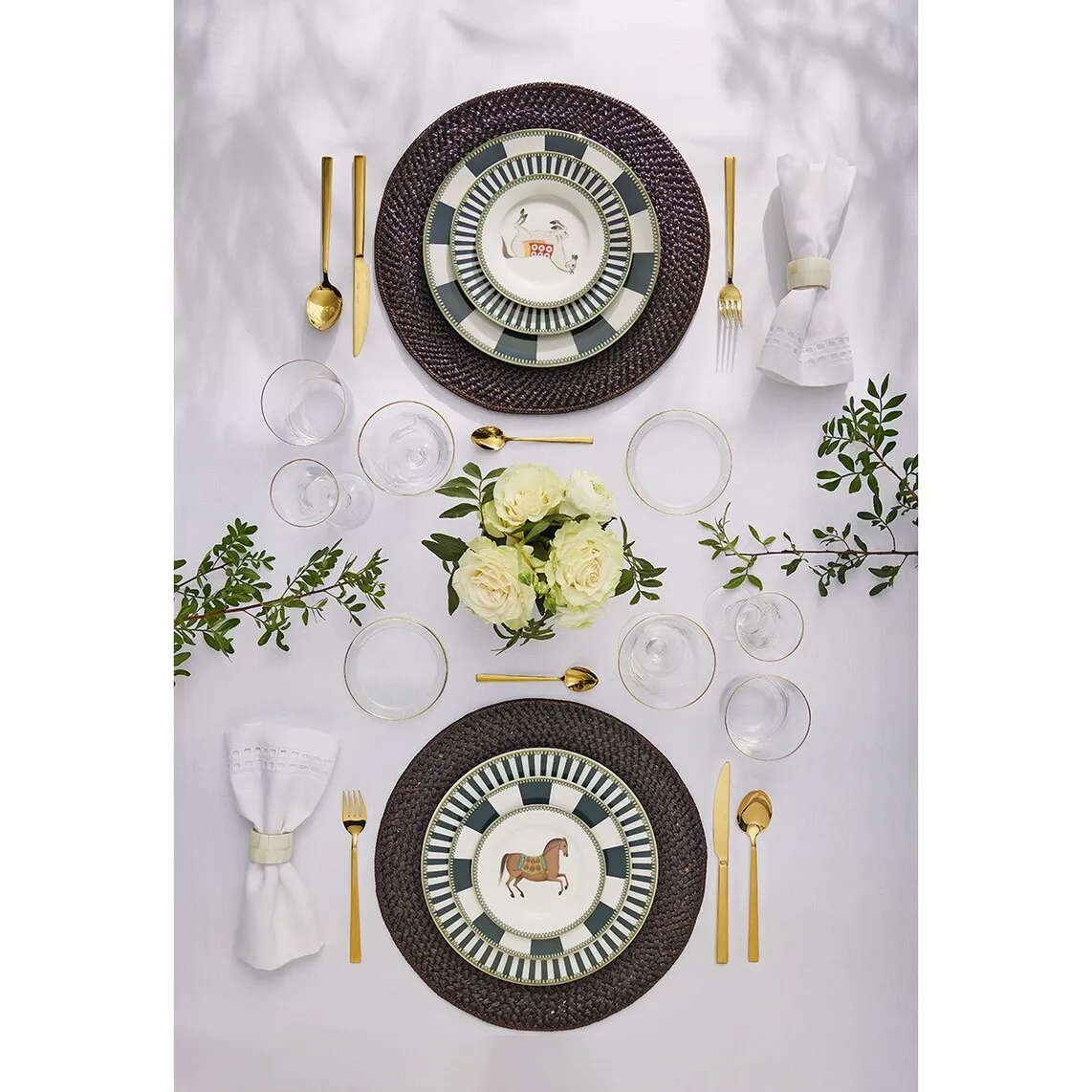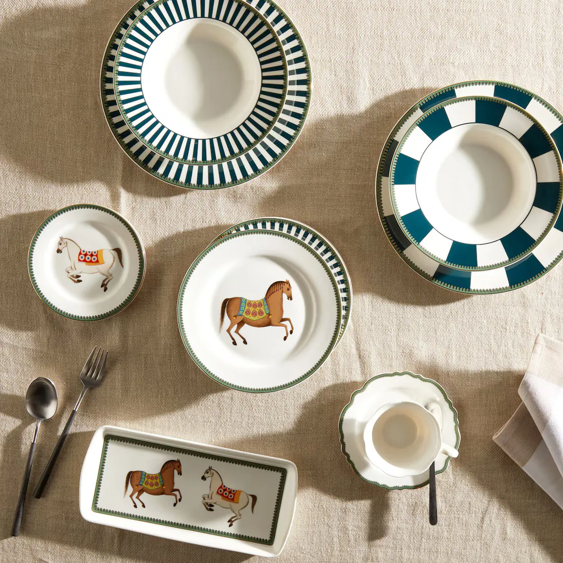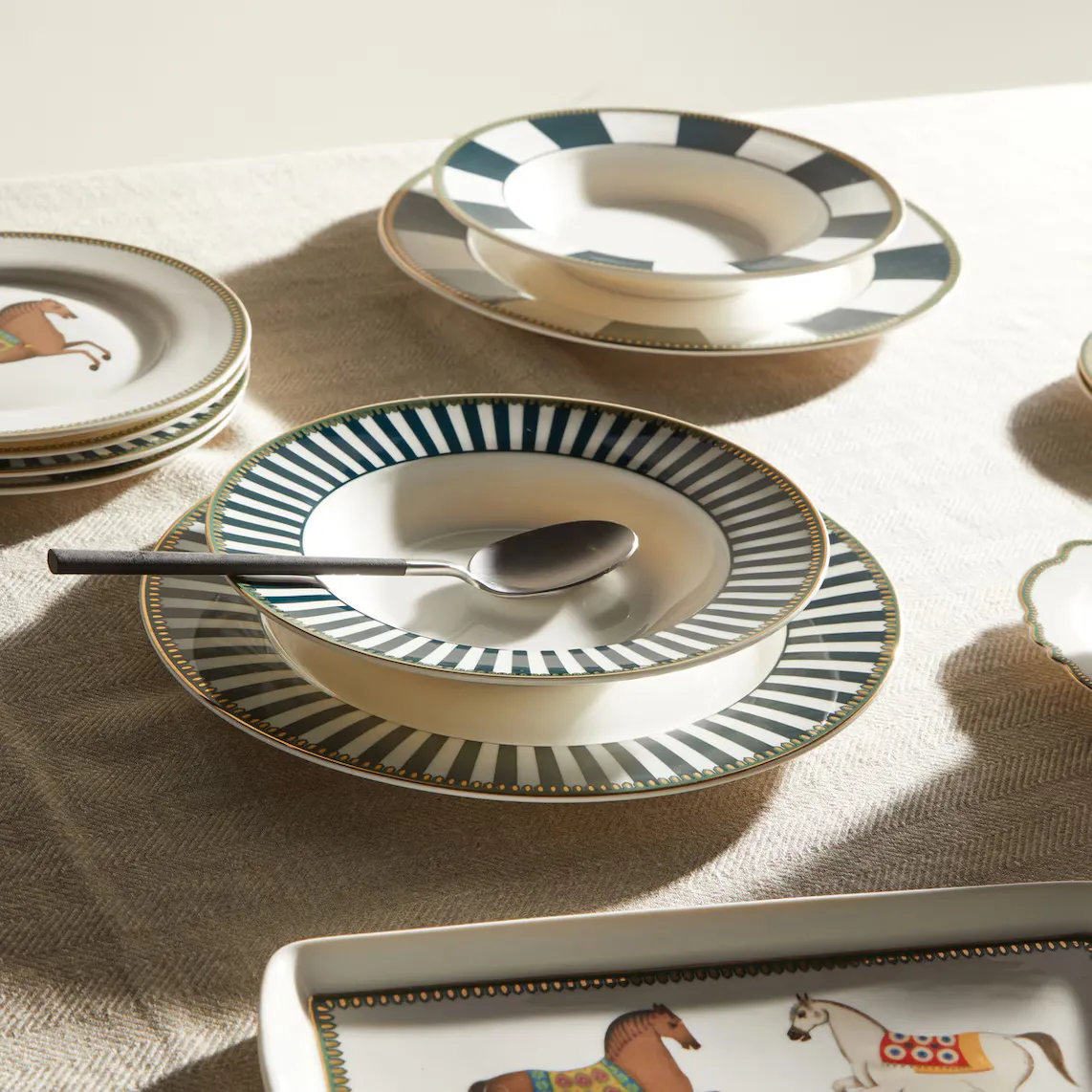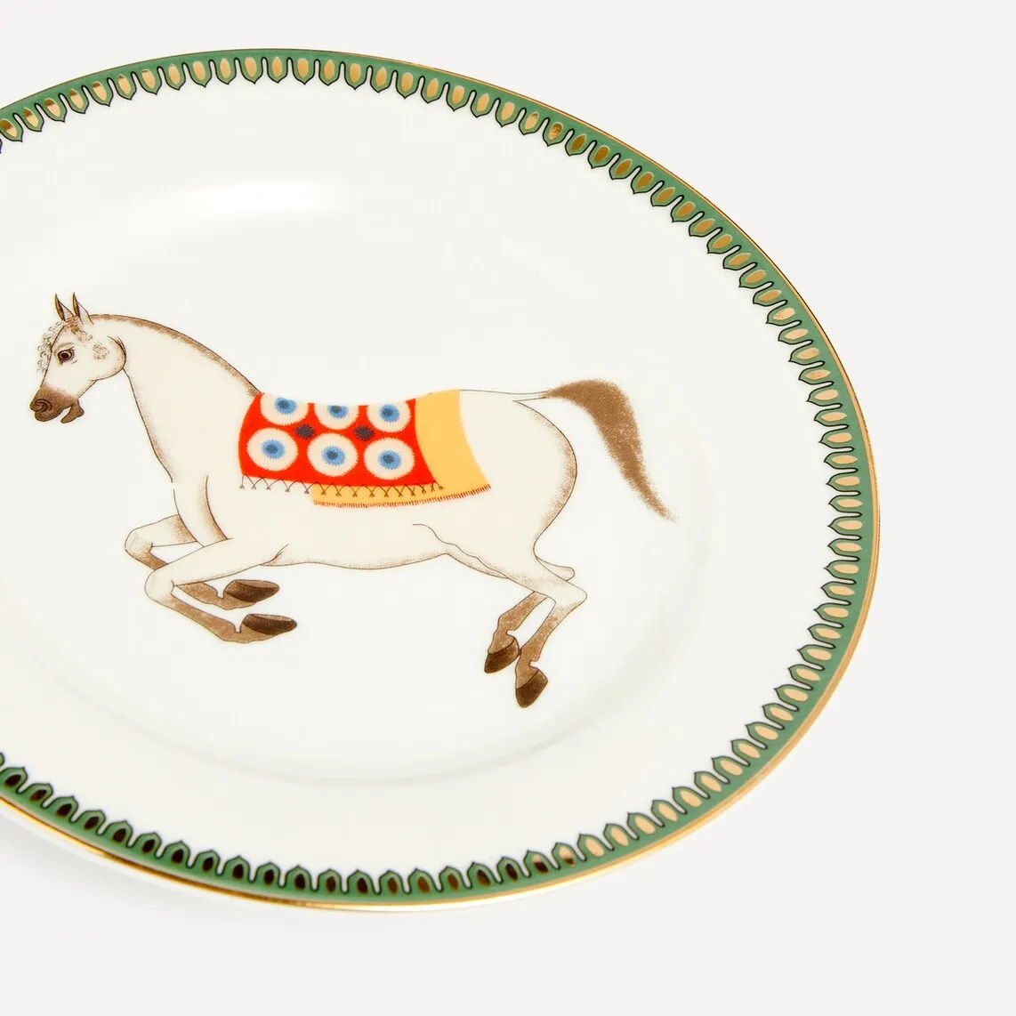 Хлебная тарелка изготовлена ​​из фарфора New Bone, материала, очень подходящего для изготовления столовой посуды, очень прочного и легкого. Эта тарелка поставляется с принтом, подчеркивающим гравюры с изображением лошадей и придающим вашему столу очень, очень элегантный вид. Он имеет синюю отделку и доступен в двух цветах на выбор.