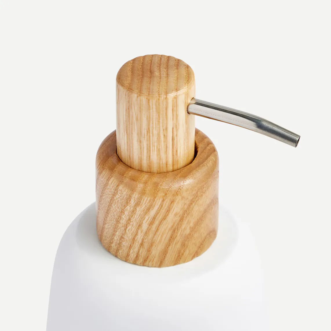 Настольный дозатор мыла из смолы с гладкой поверхностью. Кнопка деревянная, дозатор металлический.