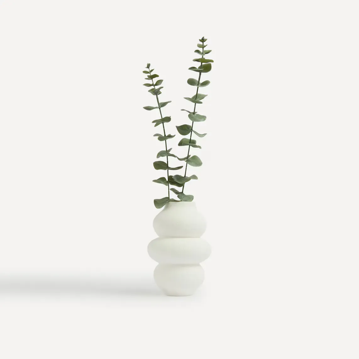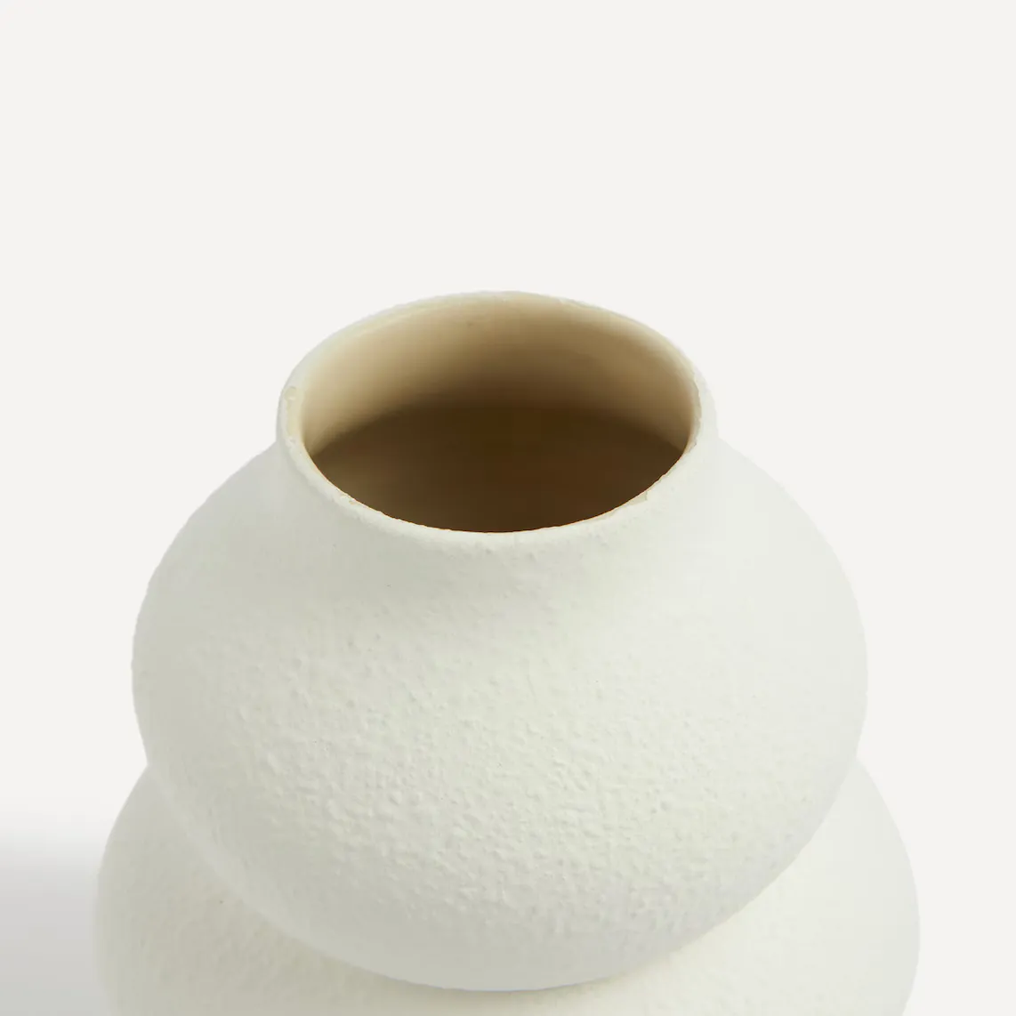 Ваза округлых форм, играющая разными размерами, изготовлена ​​из белой керамики, материала, который отличается твердостью и высокой устойчивостью к износу.