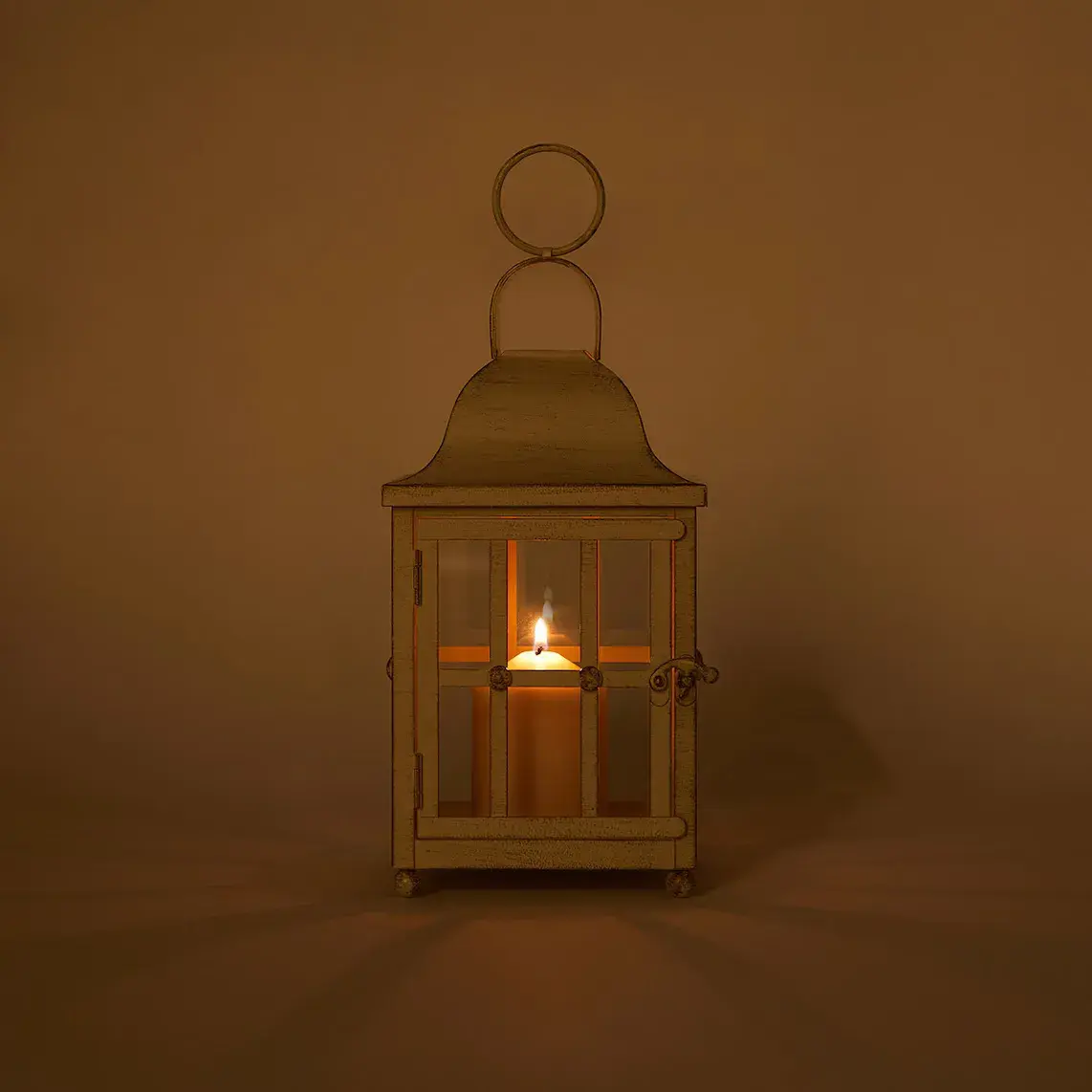 Романтический фонарь с прозрачными стенками и небольшими металлическими краями.
