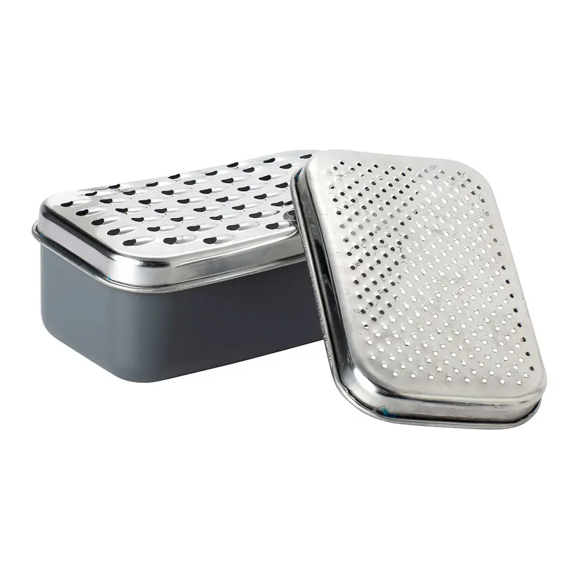 Практичная терка с 2 металлическими поверхностями и 2 различными типами нарезки. Обе поверхности помещаются в контейнер, который собирает натертые ингредиенты, не позволяя им перемещаться по столу или разделочной доске.