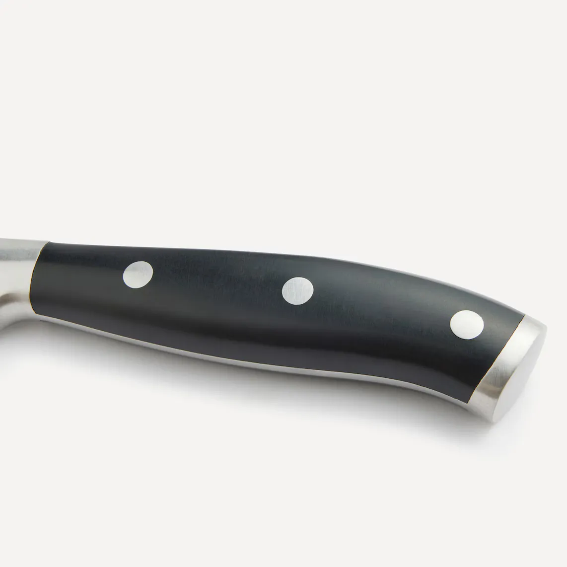 Нож из нержавеющей стали с полированной отделкой и эргономичной черной ручкой.