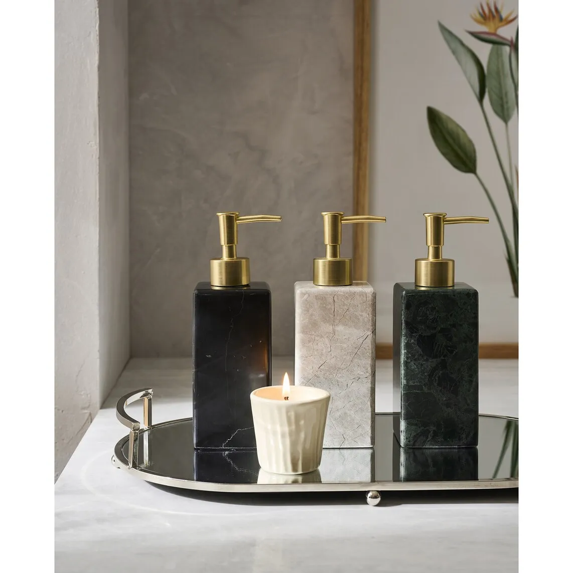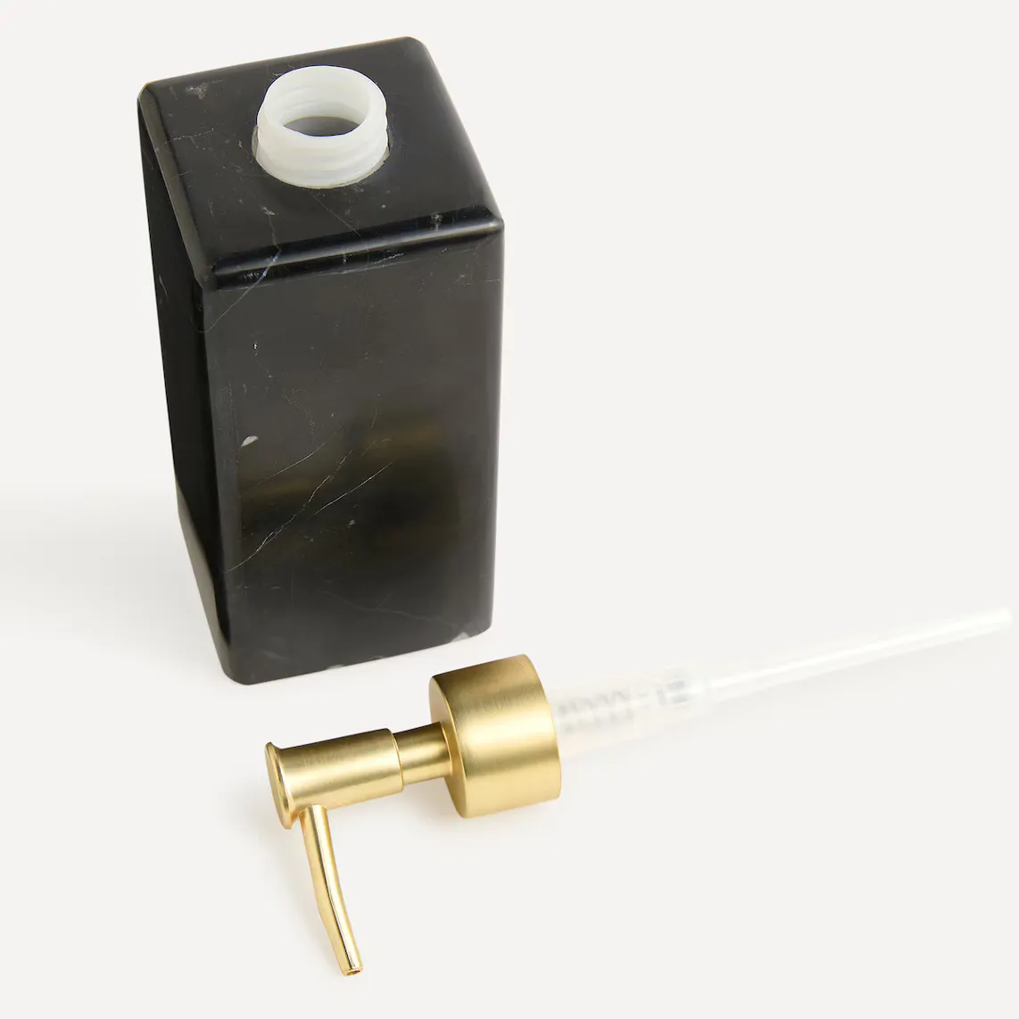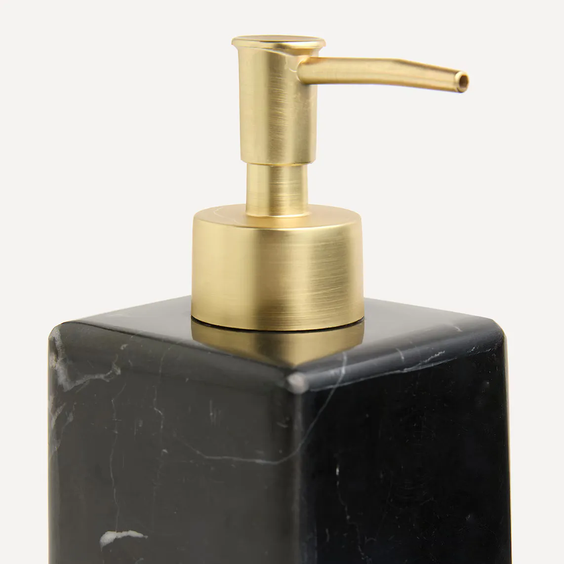 Квадратный настольный дозатор мыла из мрамора с золотой отделкой.