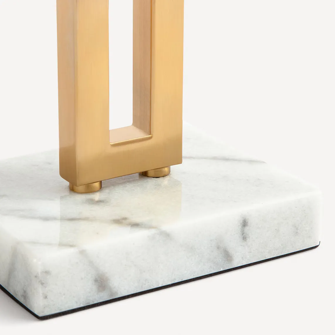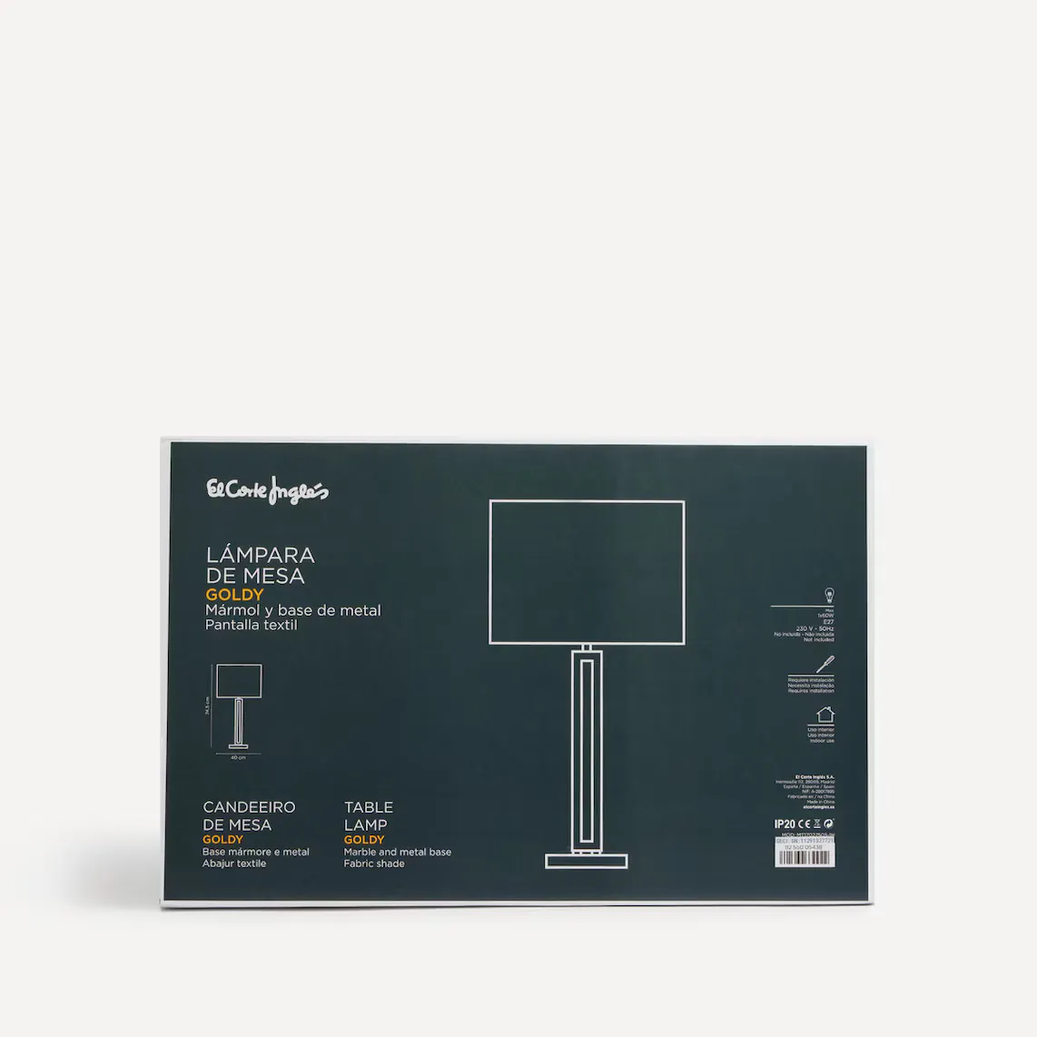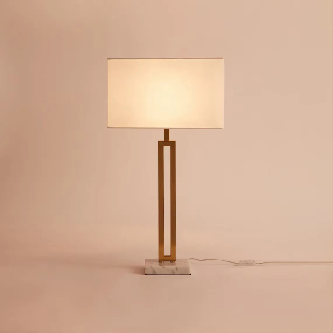 Лампа с основанием из 100% мрамора, металлическим корпусом с золотой отделкой. Экран прямоугольный, из поликоттона. Совместим с лампами с толстым цоколем E27. Лампа в комплект не входит.