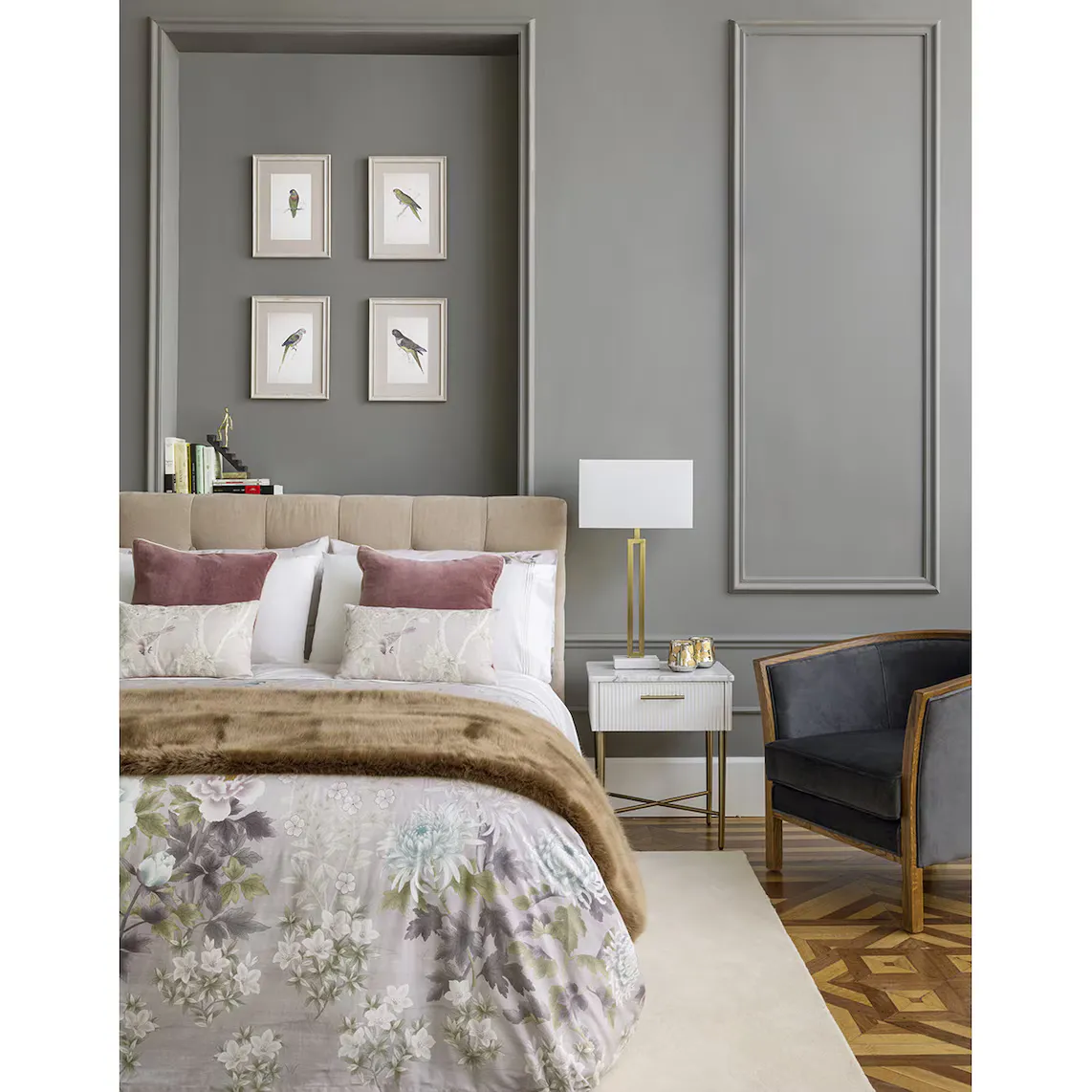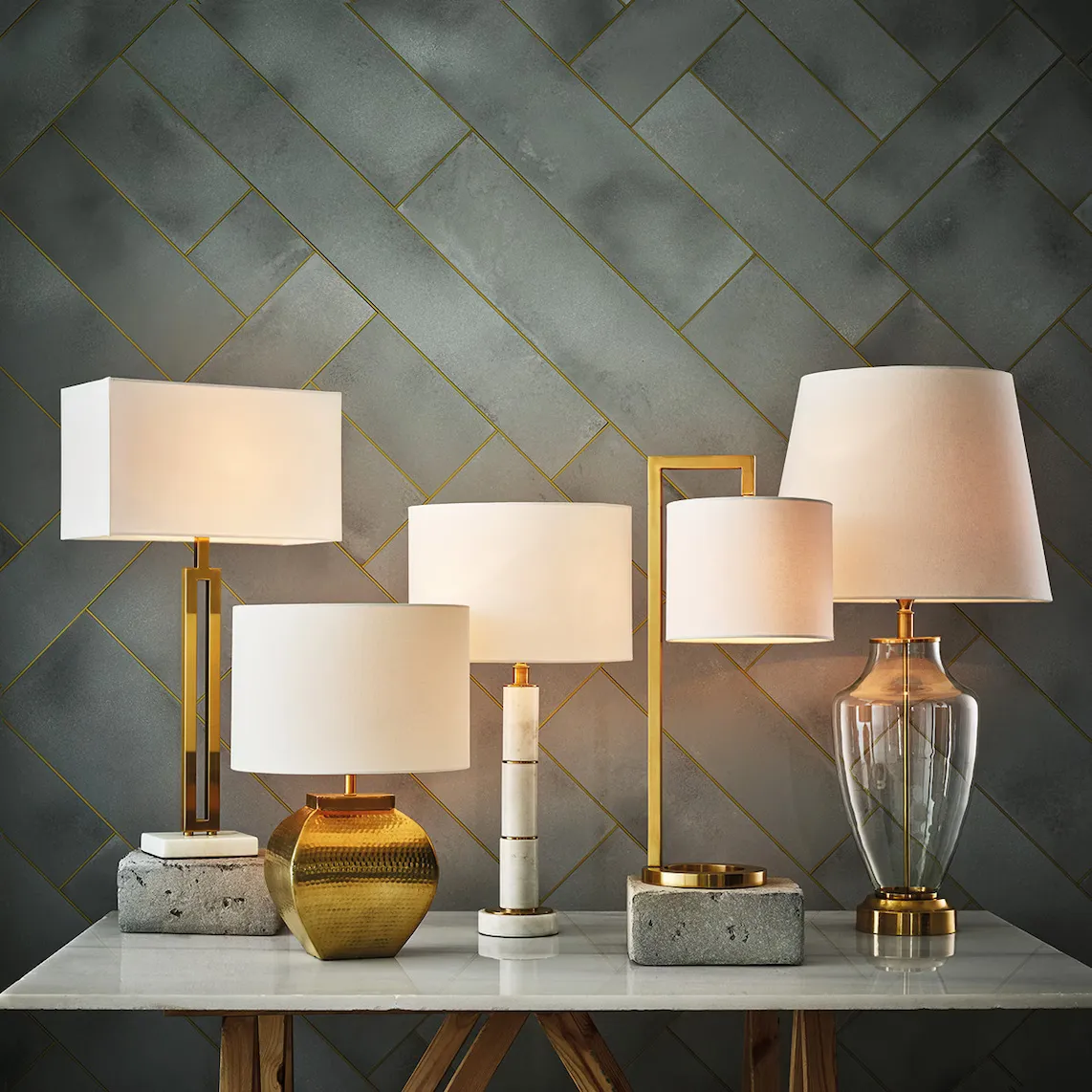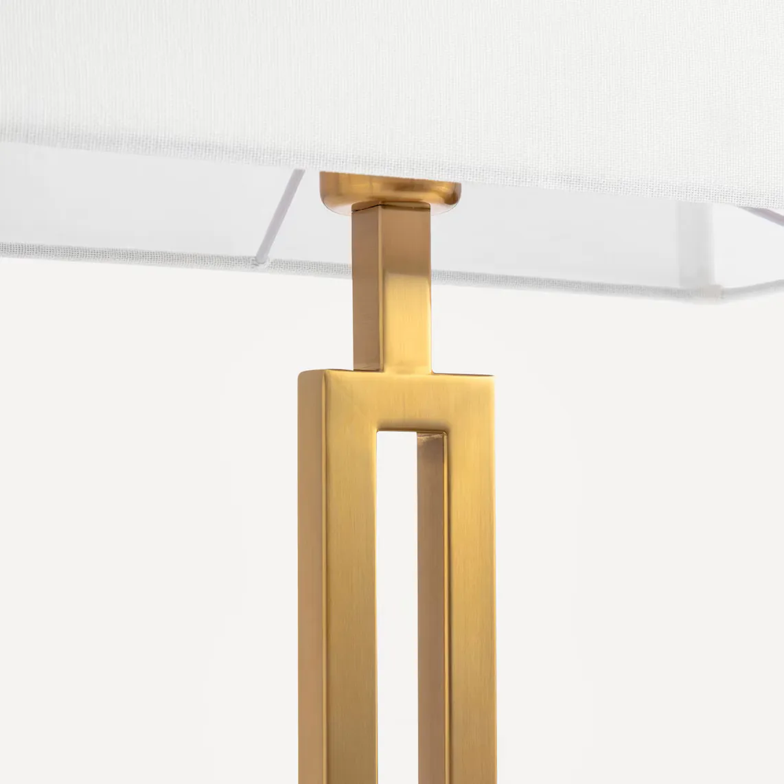 Лампа с основанием из 100% мрамора, металлическим корпусом с золотой отделкой. Экран прямоугольный, из поликоттона. Совместим с лампами с толстым цоколем E27. Лампа в комплект не входит.