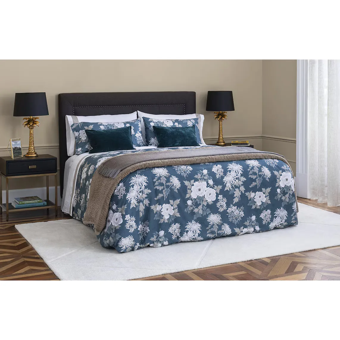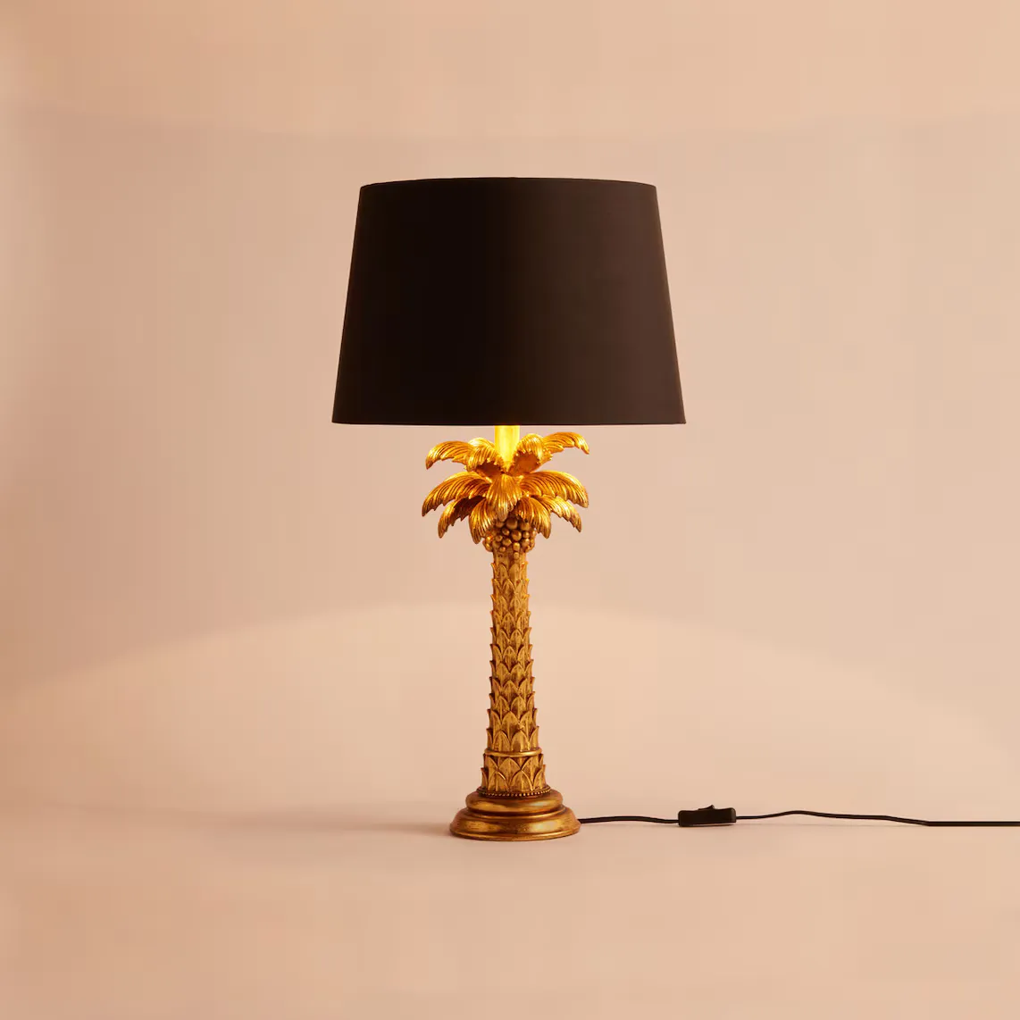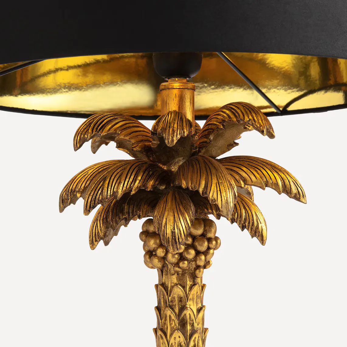 Декоративная настольная лампа с металлическим основанием и корпусом, украшенным золотой деталью в форме пальмы; Коническое сито изготовлено из поликоттона. Его вес (950 г) обеспечивает устойчивость изделия и предотвращает его легкое разбалансирование.
