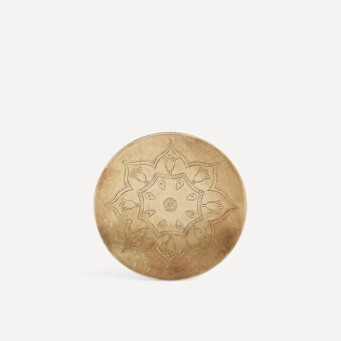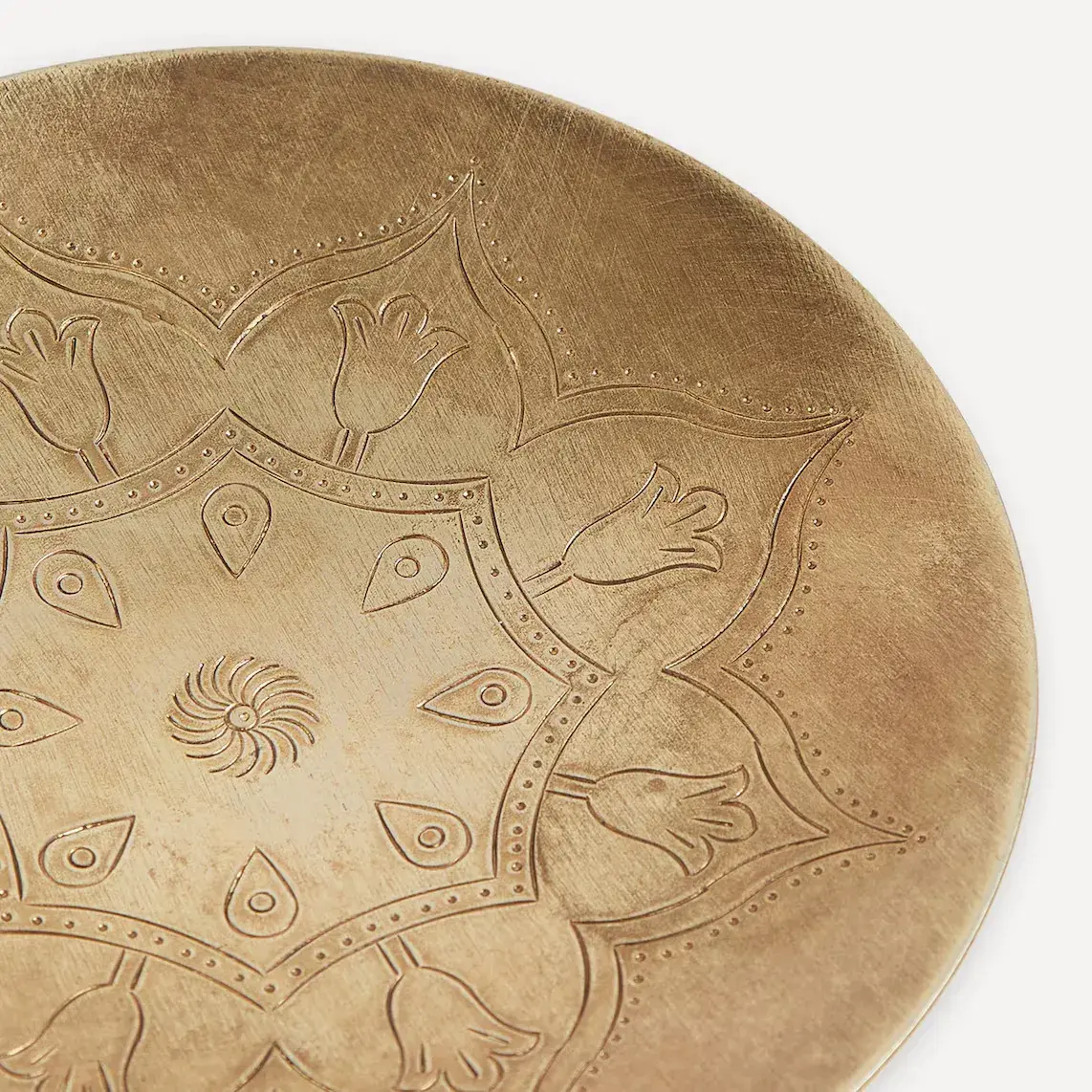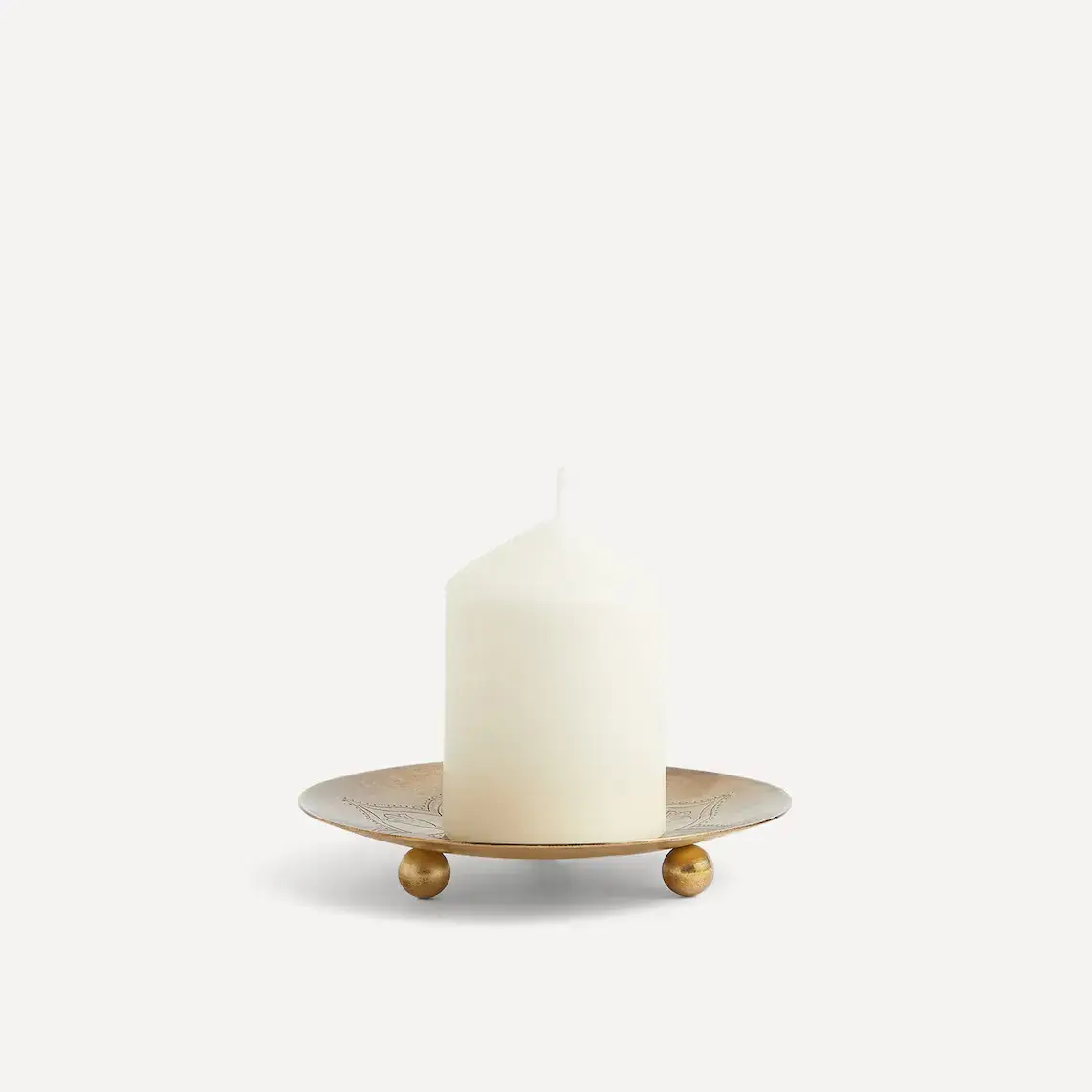 Пластина-подсвечник из железа золотистого цвета, украшенная рисунками. Декоративный и практичный элемент, с помощью которого вы добьетесь особого стиля в любой обстановке.