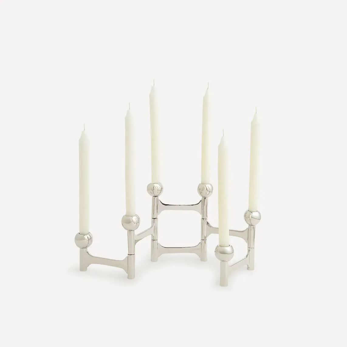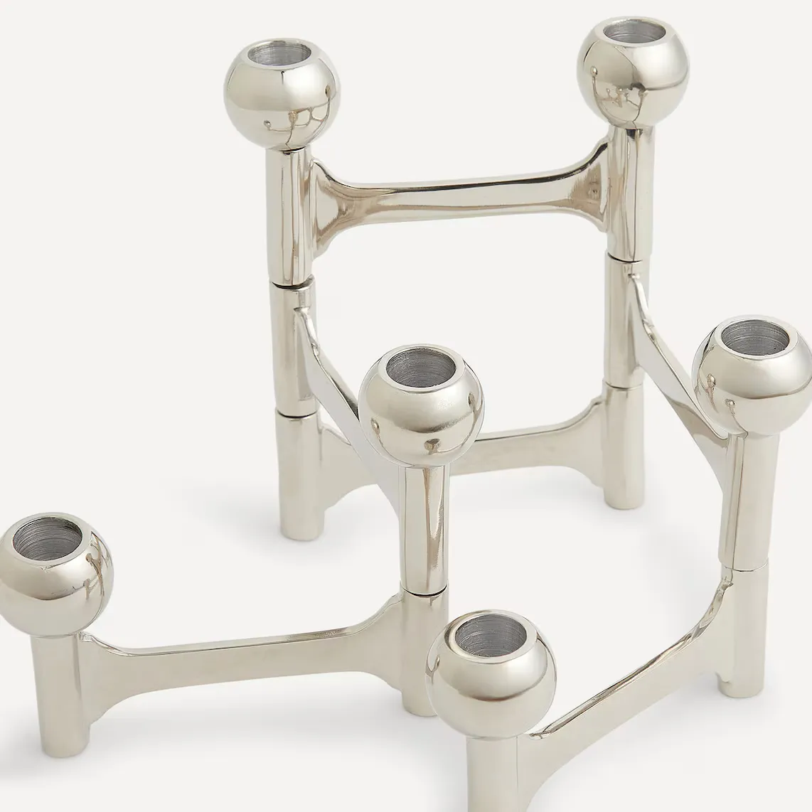 Канделябры оригинального дизайна, изготовлены из алюминия и вмещают 6 свечей. Рукава канделябров расположены на разной высоте для достижения уникального и декоративного освещения.