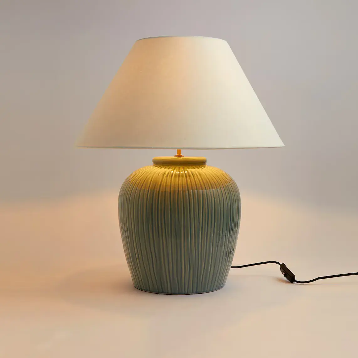 Настольная лампа состоит из большого керамического основания зеленого цвета и текстильного абажура с кремовой отделкой. Он придаст шарм и элегантность вашей прикроватной тумбочке, серванту в гостиной или предмету мебели в прихожей. Совместим с лампой с толстым цоколем E27 и максимальной мощностью 60 Вт (лампа в комплект не входит).