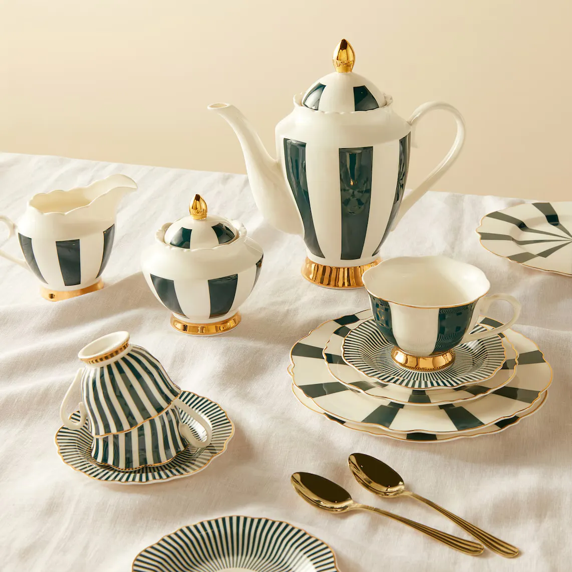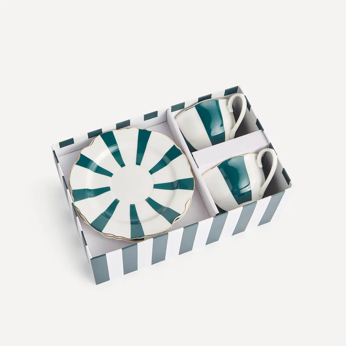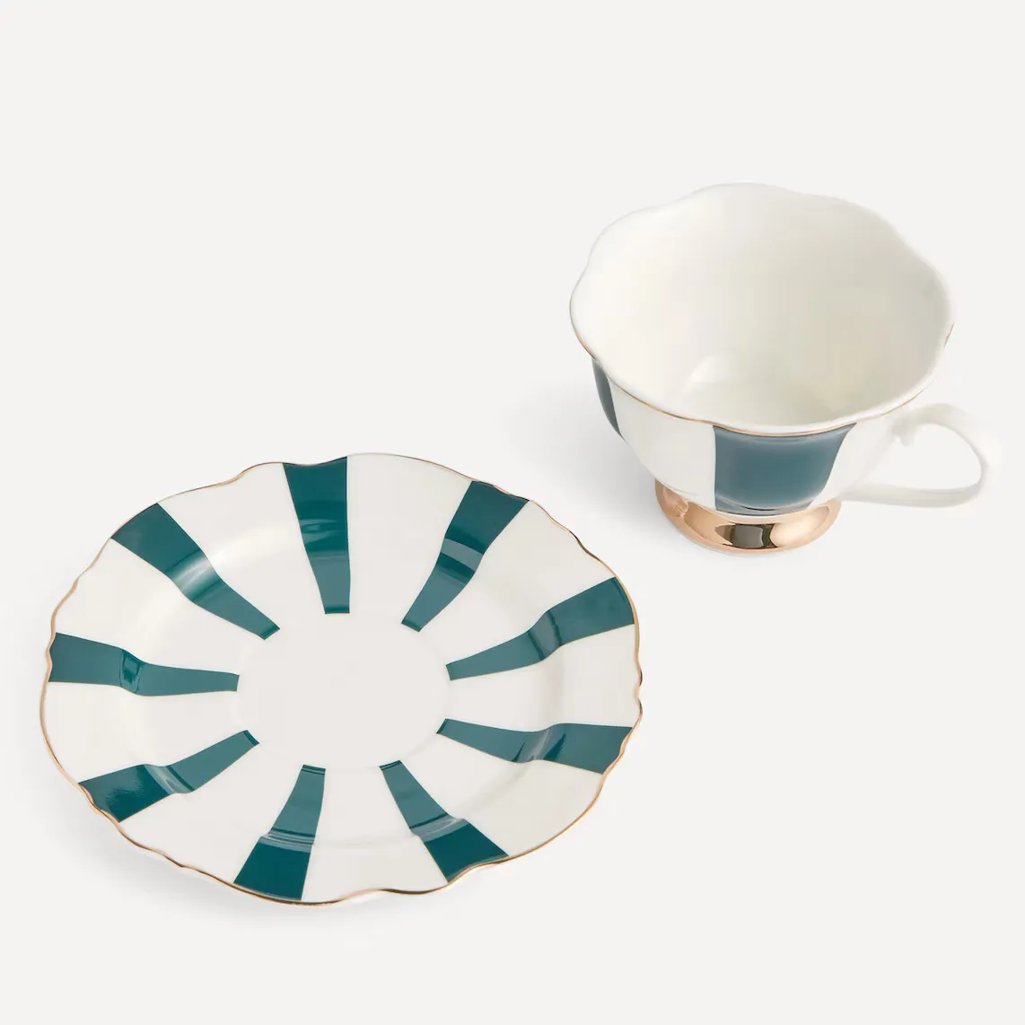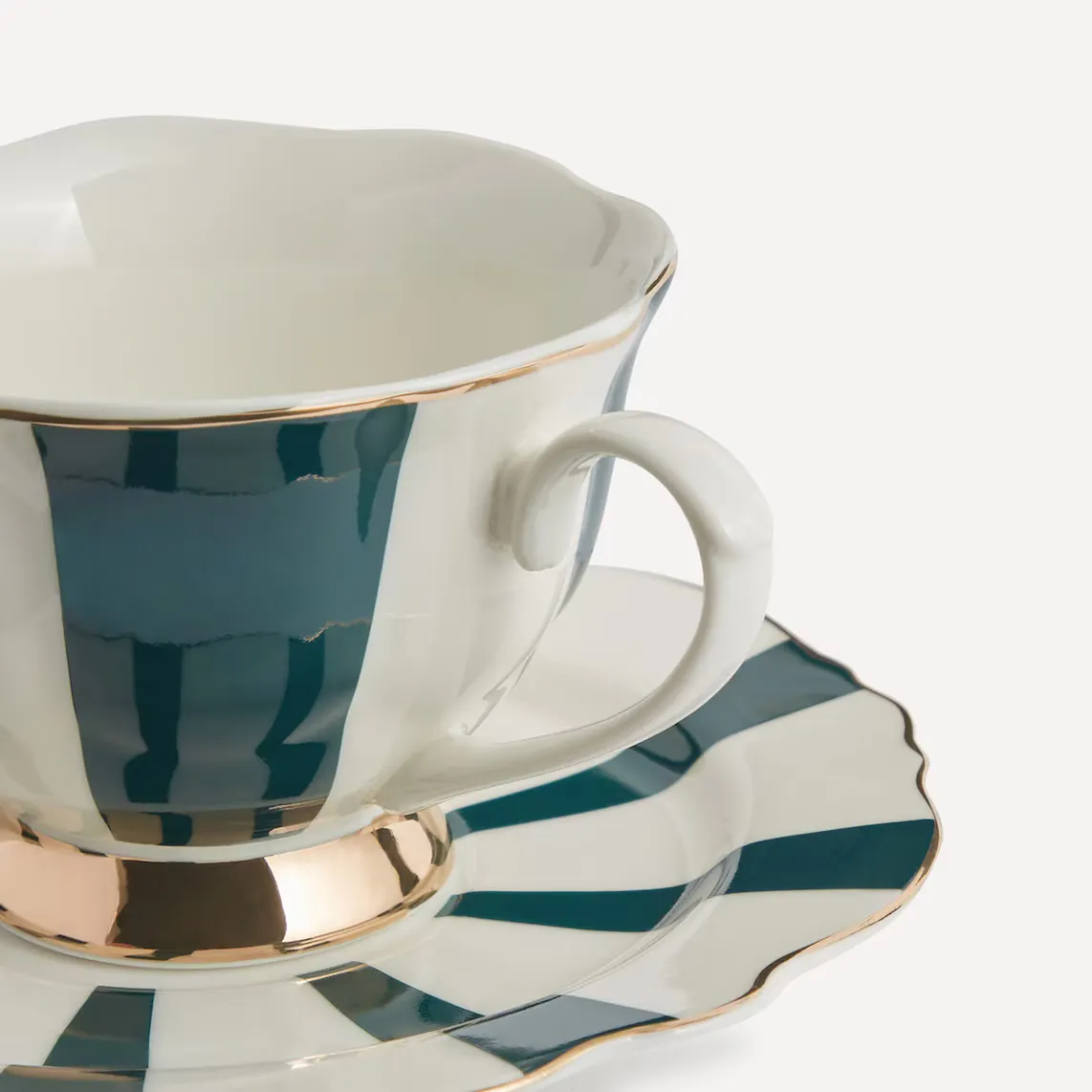 Наслаждайтесь набором из 2 чайных чашек с шармом серии Crane. Изготовлен из фарфора New Bone с принтом в зеленую полоску, с золотой основой и окантовкой. Яркое взрывное сочетание, позволяющее насладиться любимым завтраком и послеобеденным чаем.