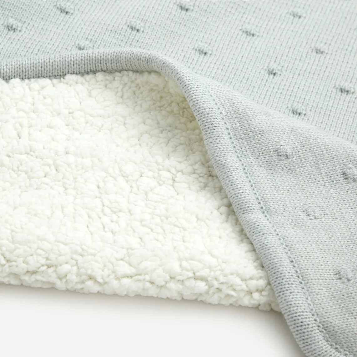 Декоративный вязаный плед с однотонным рисунком и рельефными деталями, со спинкой из шерпы.