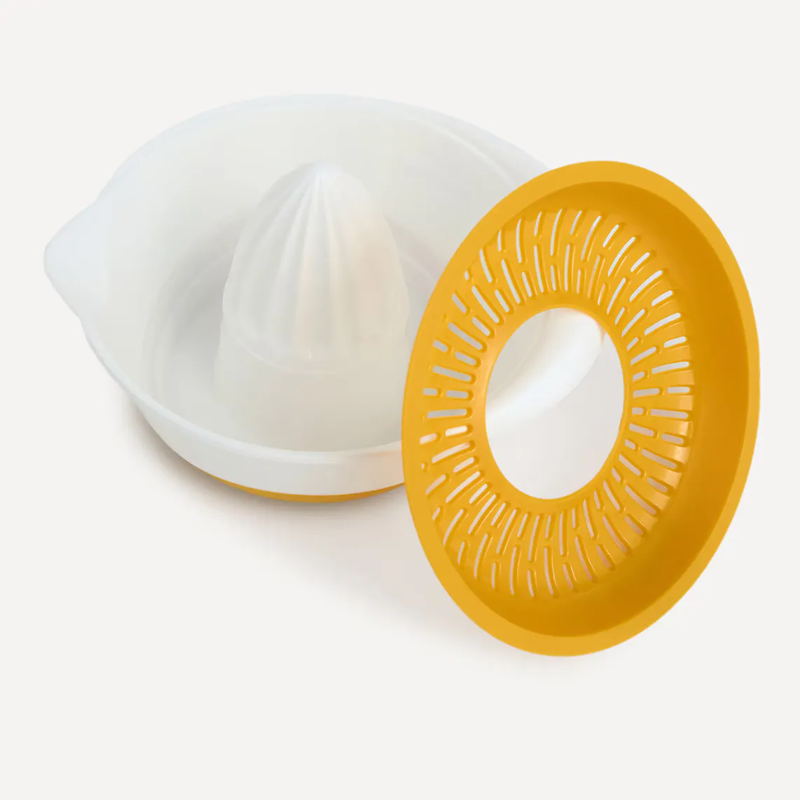 Соковыжималка для цитрусовых из пластика с нескользящим основанием. Легко мыть благодаря деталям, которые можно мыть в посудомоечной машине.