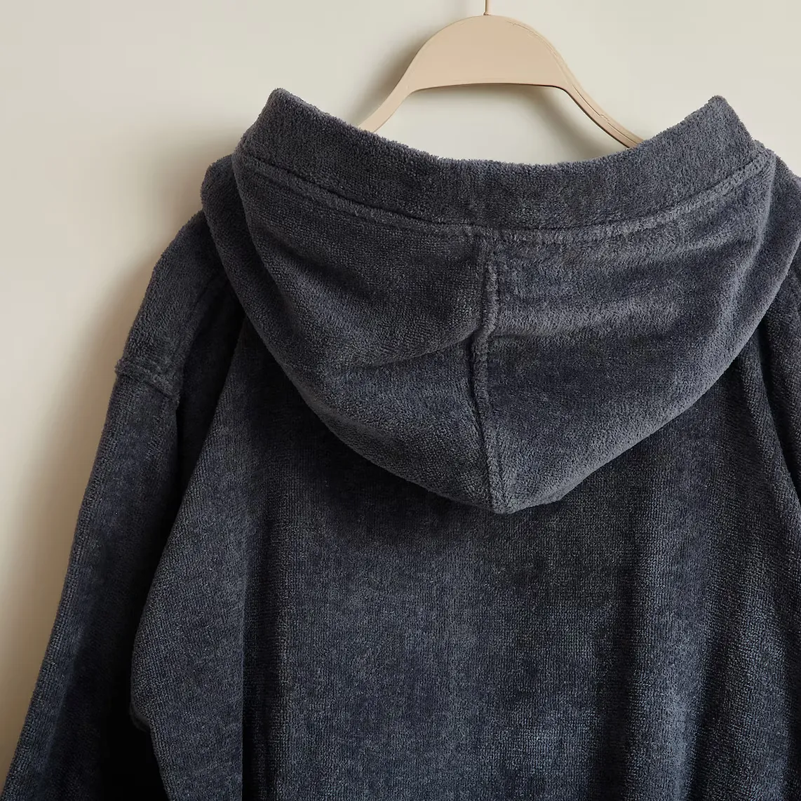 Халат с капюшоном и простым дизайном, доступен в различных цветах.