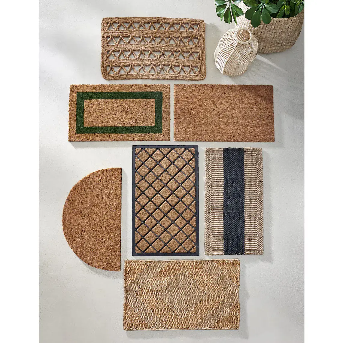 Полукруглый коврик из кокосового волокна на основе ПВХ. Кокосовое волокно очень хорошо впитывает влагу и превосходно задерживает грязь; в то время как основа из ПВХ обеспечивает стабильность и большую устойчивость.