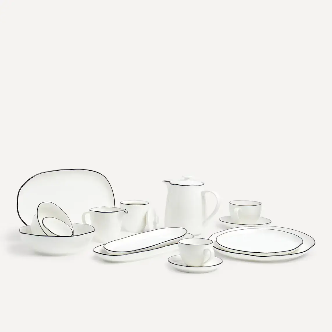 Обеденная тарелка из серии Nordik, минималистичный дизайн белого цвета с краями, декорированными в органическом черном цвете. Он изготовлен из фарфора, очень прочного и долговечного материала.