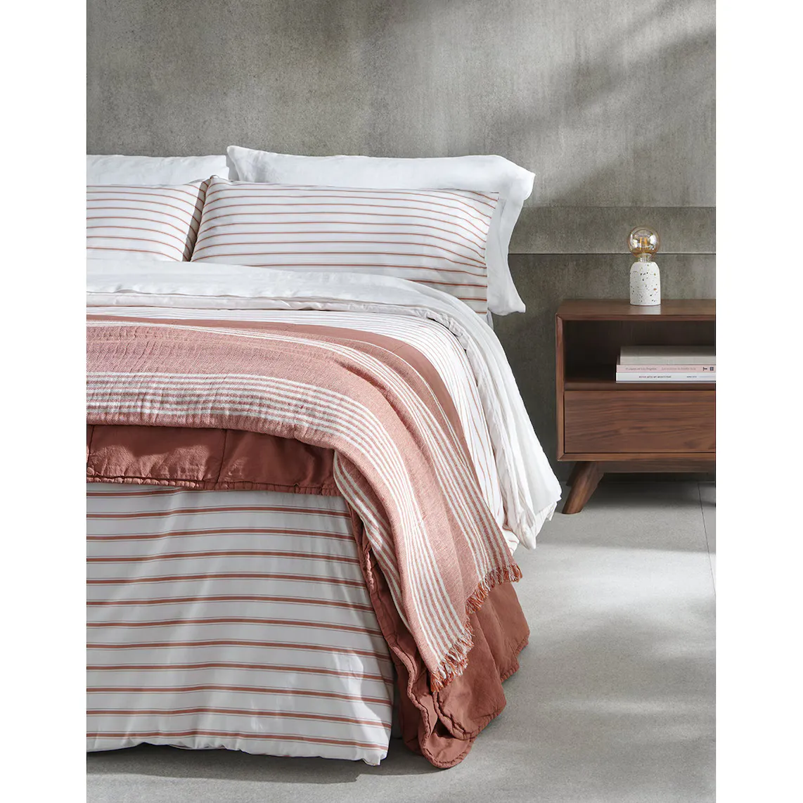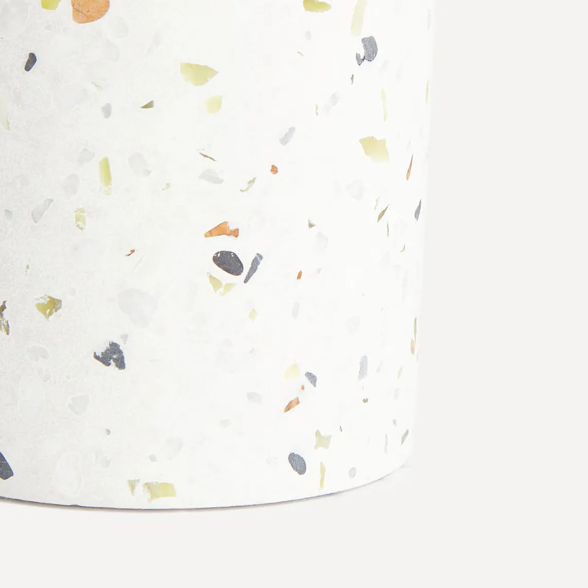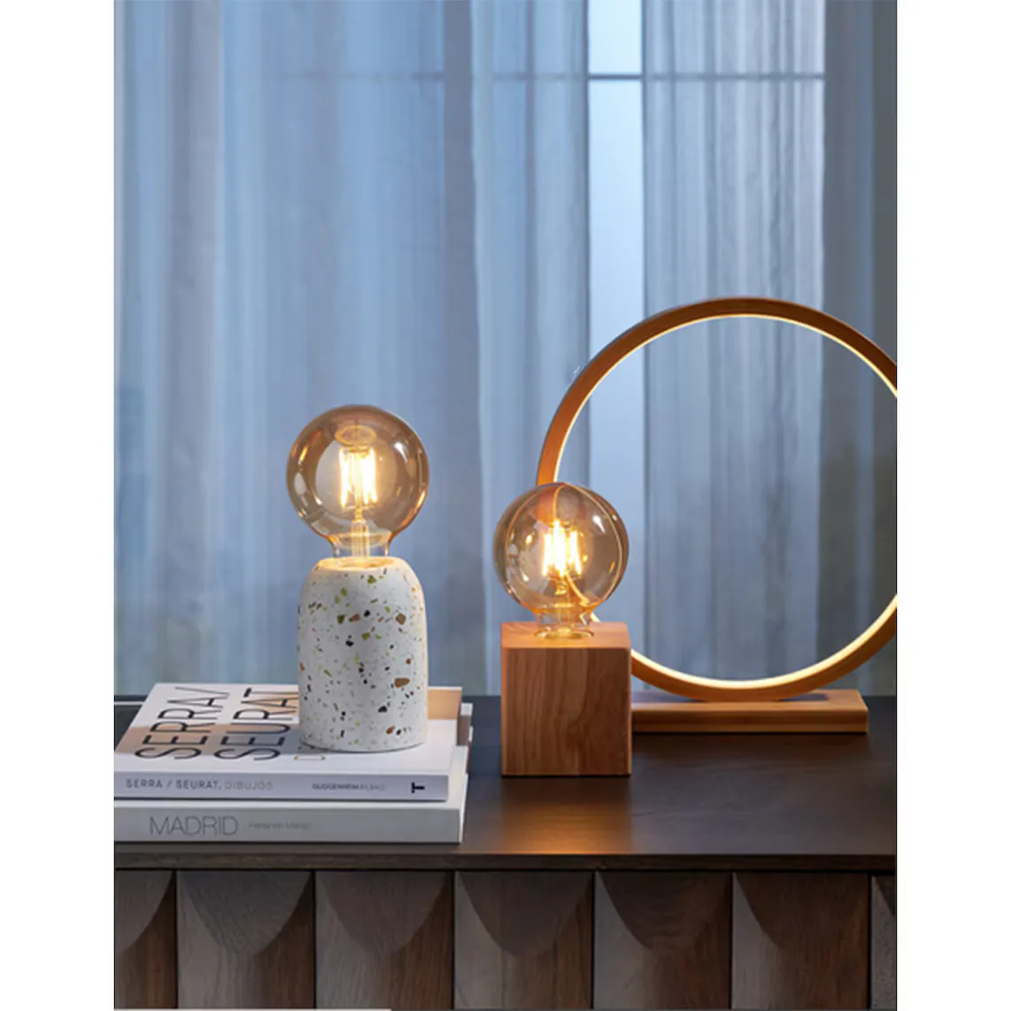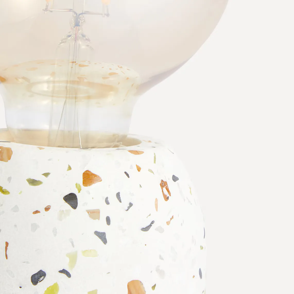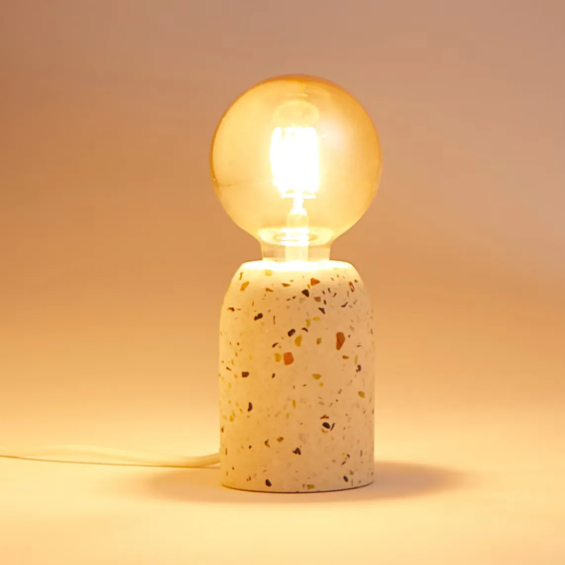 Приставная настольная лампа с матовой поверхностью из терраццо, модного материала, придающего помещению неоиндустриальный стиль. Он оснащен полукруглым цоколем и лампой E27 мощностью 3,4 Вт, излучающей очень уютный теплый свет (2200–2300 К).