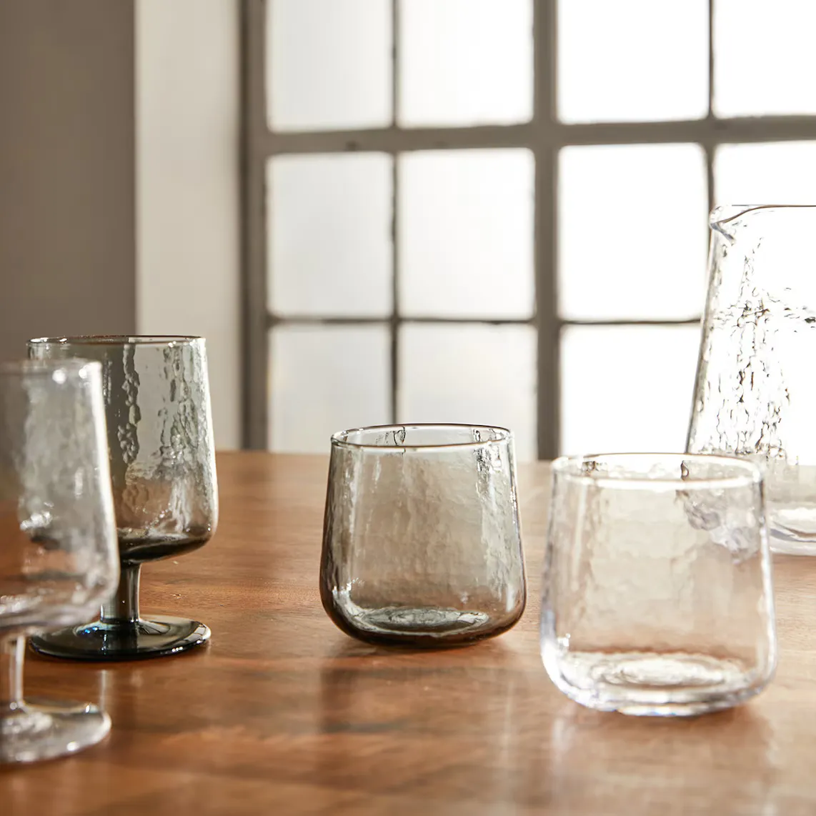Водное стекло изготовлено из стекла и имеет поразительный кованый эффект, что придает ему очень оригинальную текстуру. Вы можете выбрать между прозрачным и серым цветом, в зависимости от наличия, или объединить обе модели для получения уникального результата.