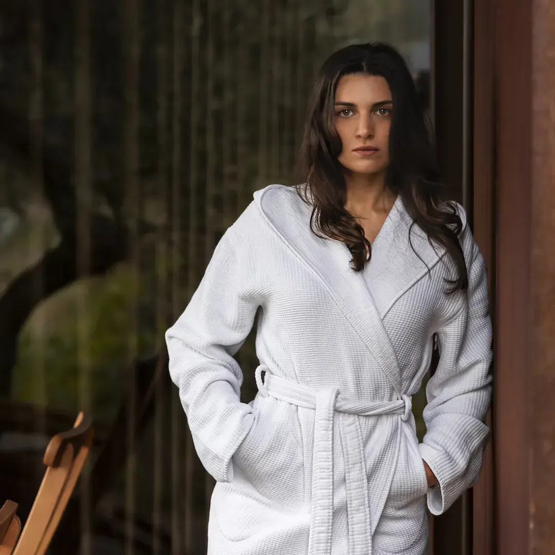 Халат Melody полностью изготовлен из хлопка. Это нулевое скручивание, что гарантирует сверхмягкое и гладкое прикосновение с превосходной поглощающей способностью. Быстросохнущая и очень легкая, она гарантирует полный комфорт.
