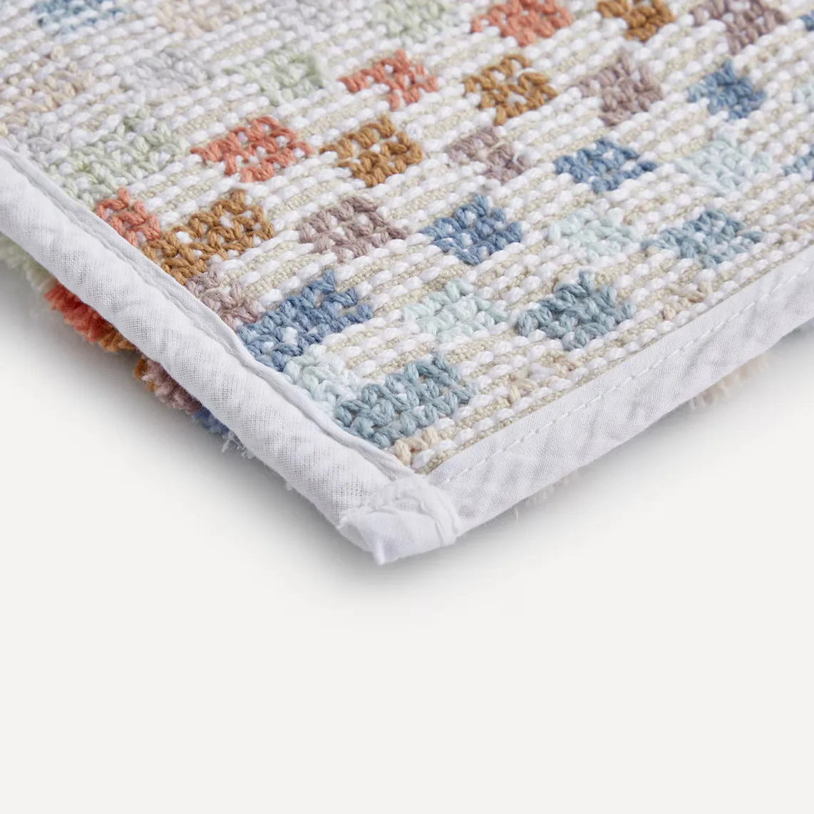Коврик для ванной с жаккардовым узором, окрашенным в разноцветную пряжу.