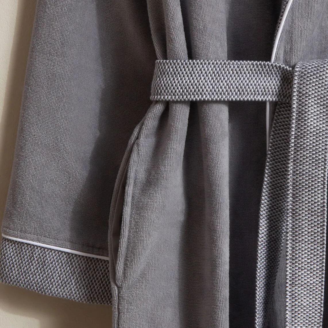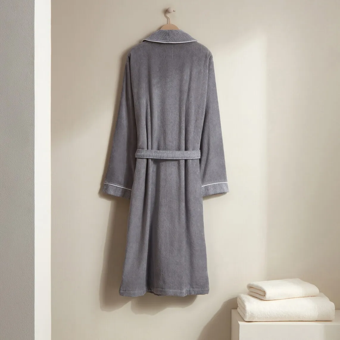 Халат с велюровой отделкой и простым дизайном с контрастными лацканами, манжетами и поясом.