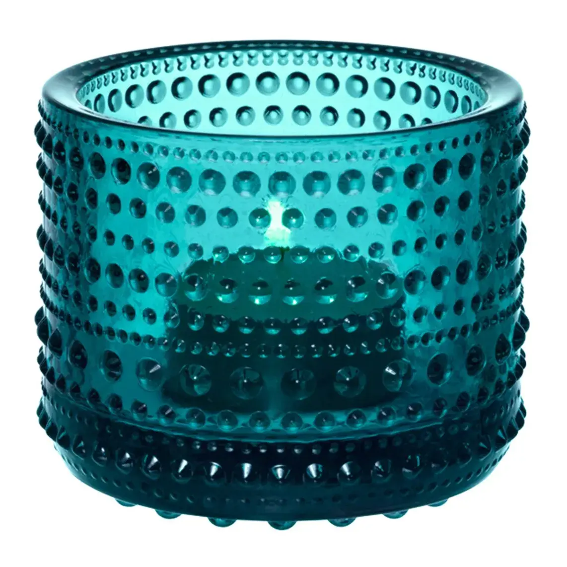 Подсвечник в стиле Tealight, принадлежащий серии Kastehelmi Iittala. Его дизайн выделяется стеклянными каплями, которые соединяются в кольца, напоминающие капли росы, сияющие на солнце.