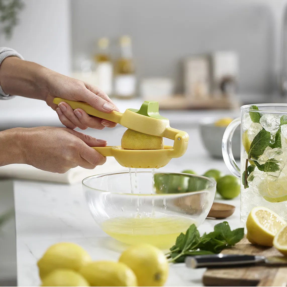 Соковыжималка для цитрусовых из нейлона и нержавеющей стали с двойным действием: она сжимает при нажатии, а затем вращается, чтобы получить максимум сока. Кроме того, он улавливает семена и мякоть, что упрощает их утилизацию. Идеальная соковыжималка для отжима лимонов, лаймов, небольших апельсинов и мандаринов.