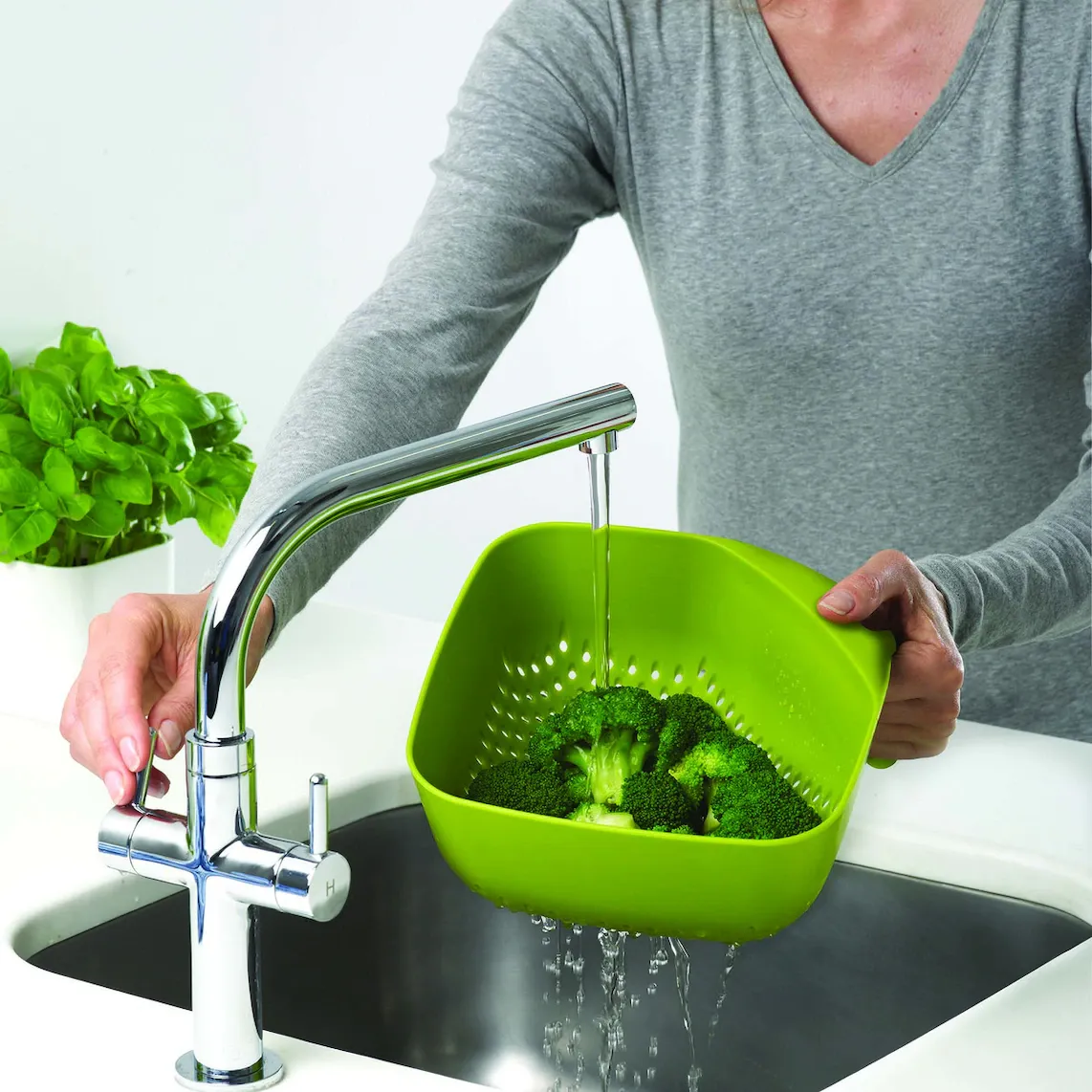 Практичный слив с широкими и удлиненными отверстиями для удобного слива, изготовлен из пластика, не содержащего BPA. Изогнутая ручка изготовлена ​​из силикона и не мешает хранить или мыть в раковине. Кроме того, она имеет нескользящее покрытие, а форма всей посуды позволяет легко вынимать вымытую пищу.