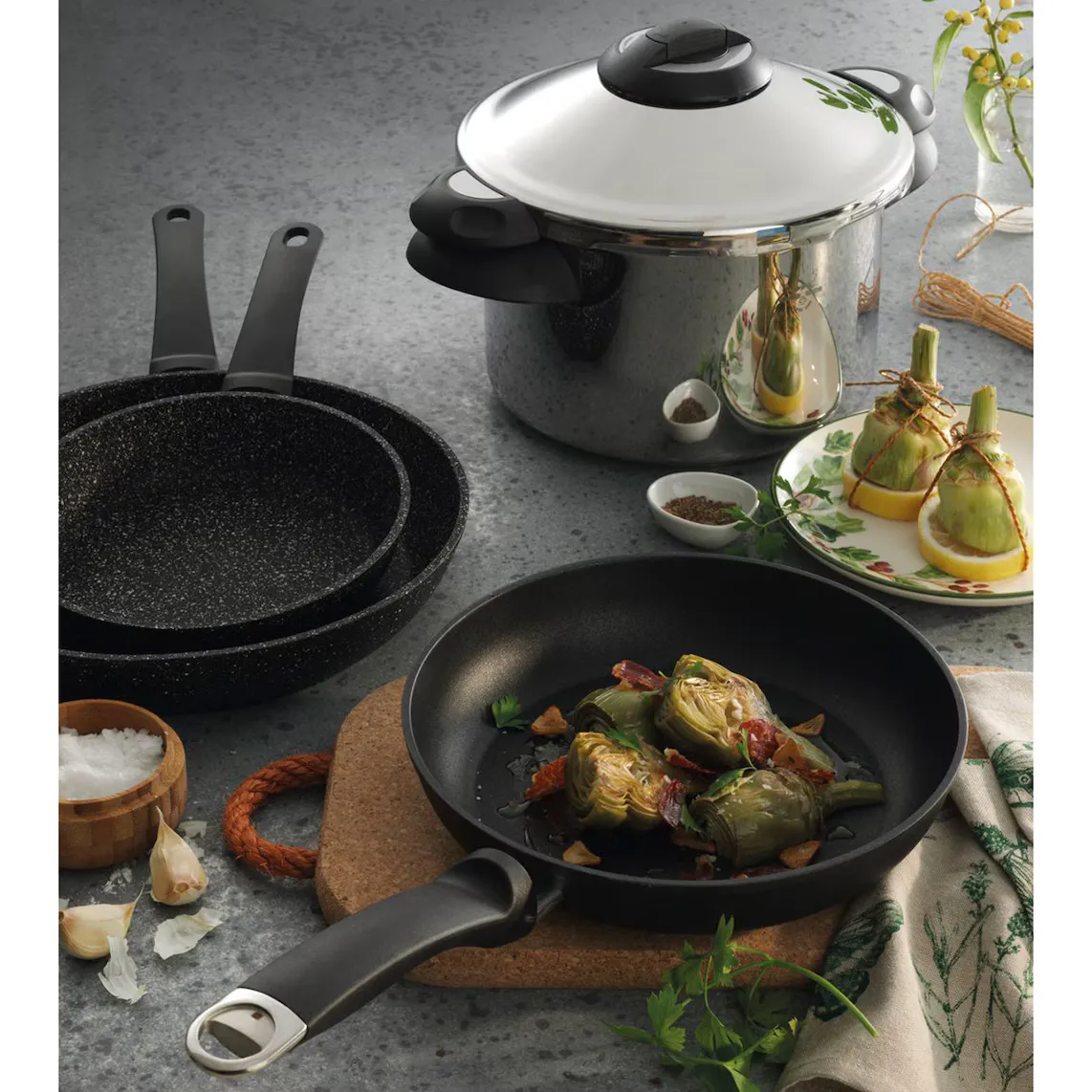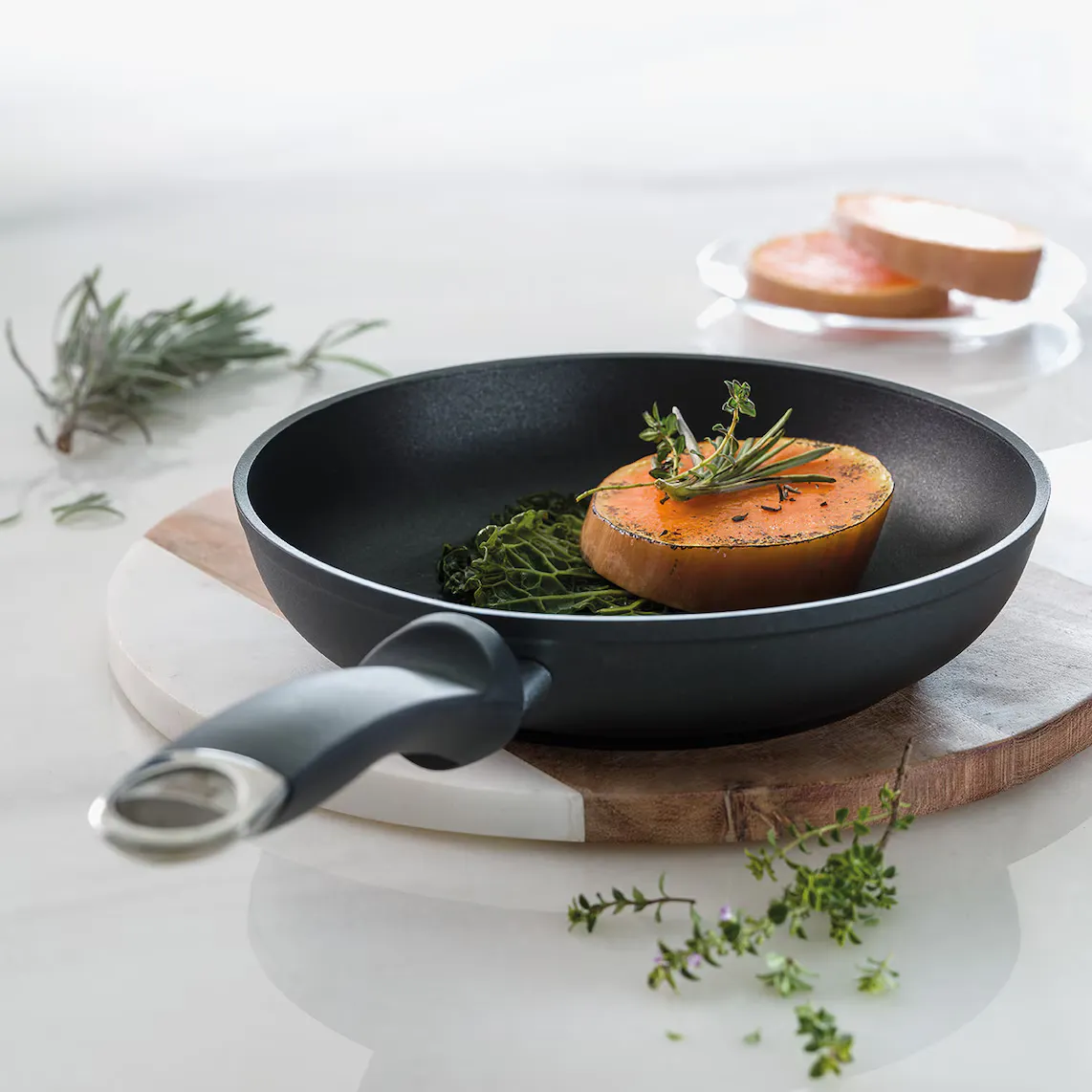Идеально подходит для приготовления всех видов блюд благодаря общей индукционной поверхности и дну толщиной 5,5 см, которые обеспечивают оптимальную передачу тепла. На этой сковороде пища готовится равномерно, а также позволяет использовать меньше масла.