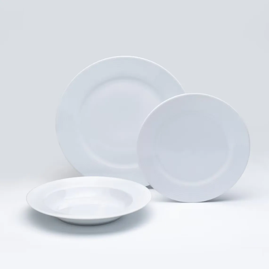 Столовая посуда из 18 предметов: 6 обеденных тарелок, 6 глубоких тарелок и 6 десертных тарелок. Он изготовлен из фарфора, материала, широко используемого в посуде и декоративных предметах, благодаря своей твердости, отделке, непроницаемости и устойчивости к термическим ударам.