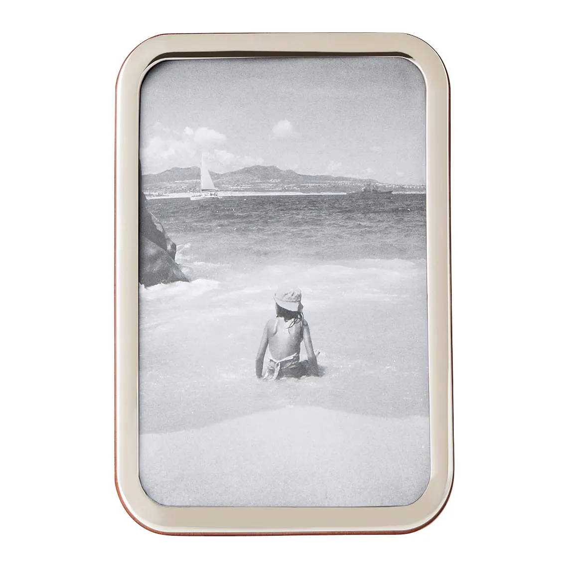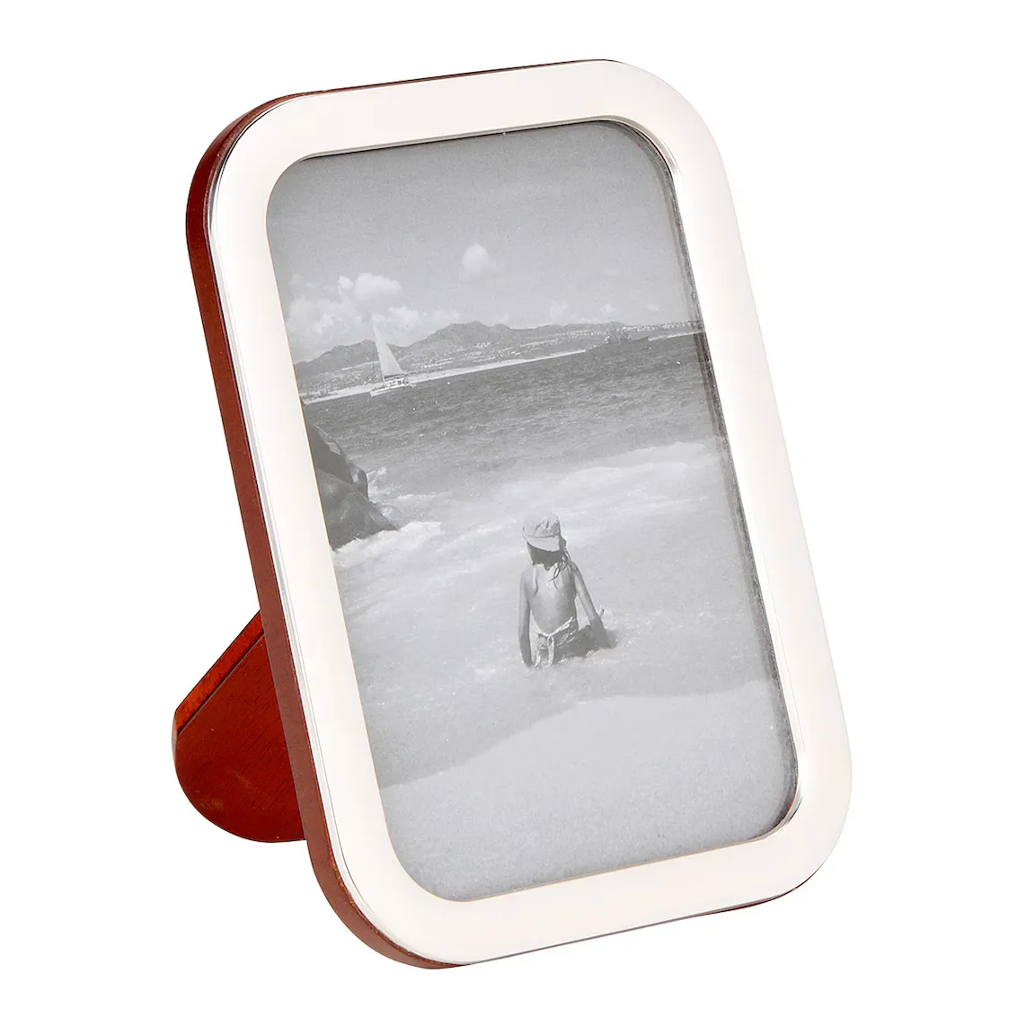 Эта фоторамка, изготовленная из стерлингового серебра, сочетает в себе классический дизайн с современными нотками закругленной формы краев и блестящей серебряной отделки.