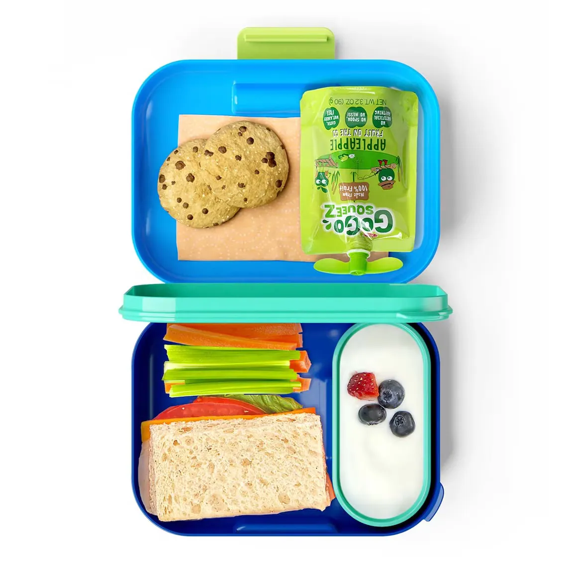 Портативный ланч-бокс, в котором можно взять сэндвич или перекус в школу или на экскурсию. Он изготовлен из пластика и силикона, не содержит BPA. Внутреннее пространство разделено на несколько отделений, в которых можно организовать еду.