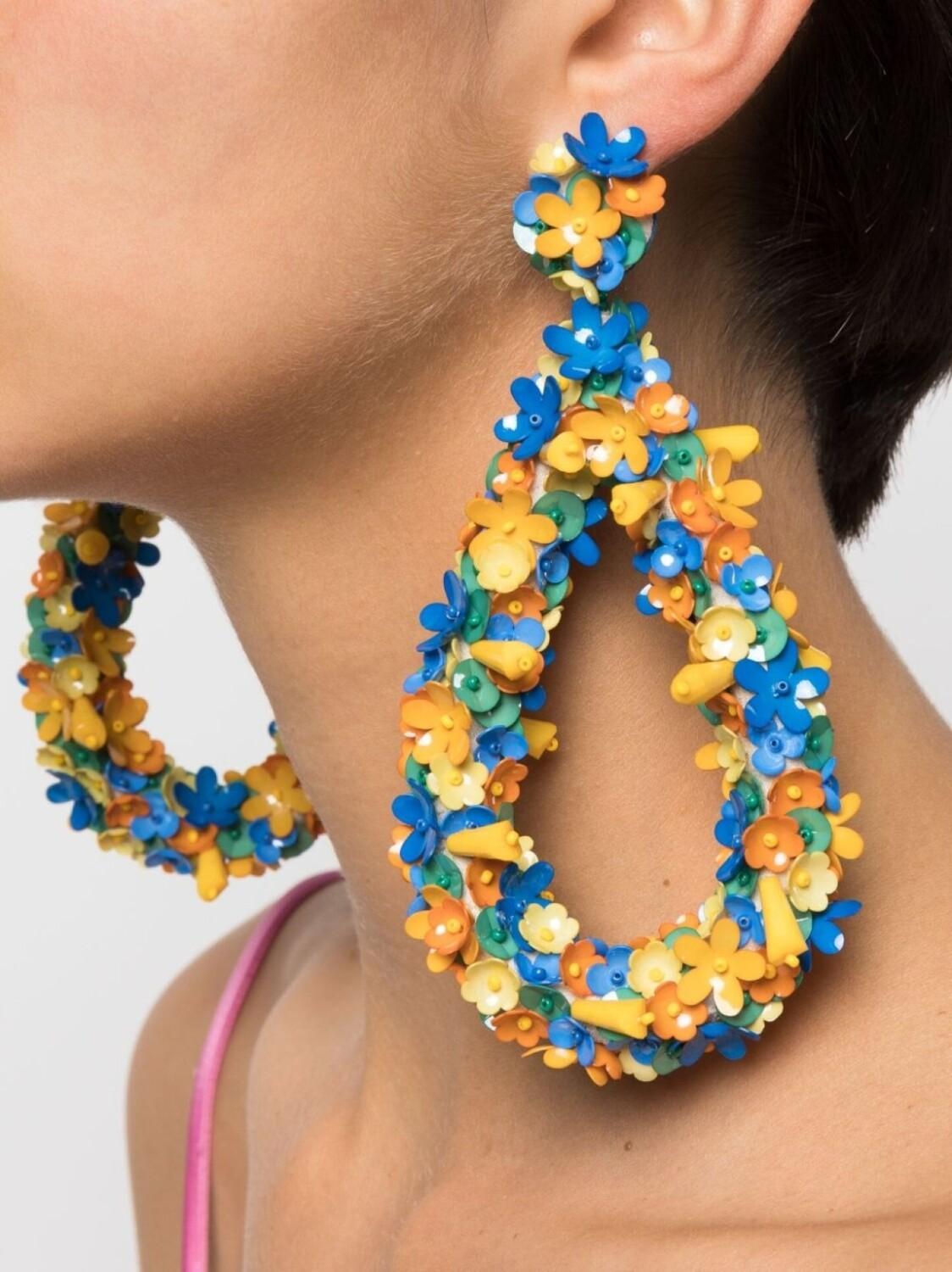 Цветочная деталь, серьги-подвески, овальные кольца, застежка-бабочка и для проколотых ушей. В комплект входят две серьги.