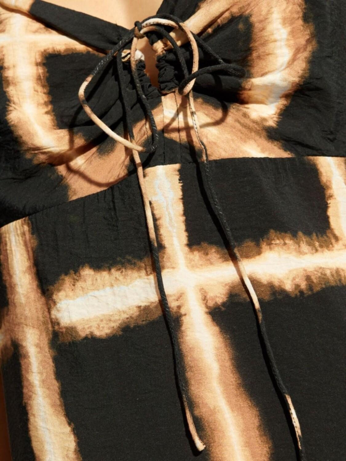 Черный/коричневый, принт в клетку, вырез в форме сердца, завязки спереди, короткие рукава-буфы, прямой подол, средней длины