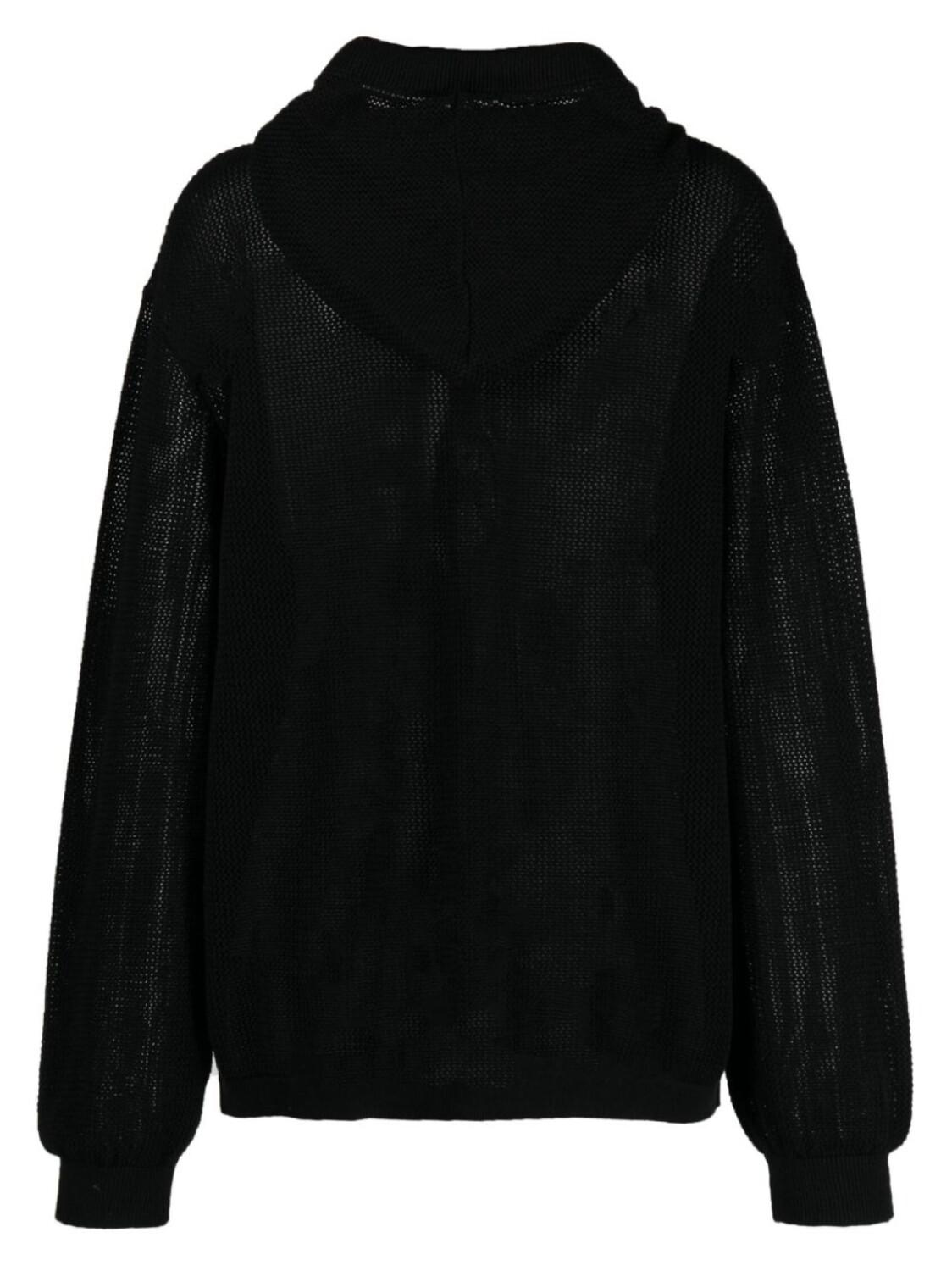 Черный, хлопок, кроше, затягивающийся на шнурок капюшон, длинные рукава, прямой подол и застежка на молнии спереди.