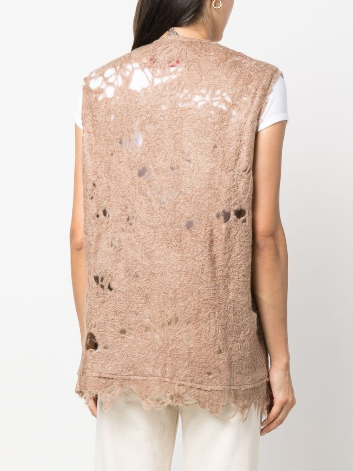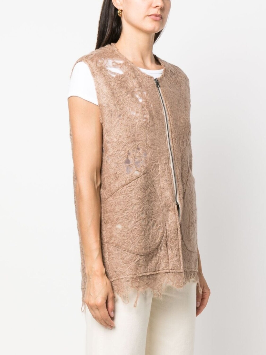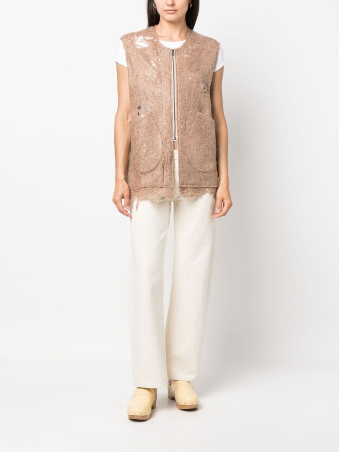 Экрю, смесовая шерсть, искусственно состаренное покрытие, круглый вырез, без рукавов, два накладных кармана спереди, необработанные края и застежка на молнии спереди.