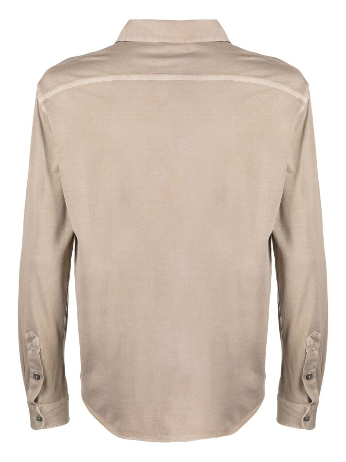 Бежевый, хлопок, классический воротник, застежка на пуговицах спереди, длинные рукава, манжеты на пуговицах и закругленный подол сзади.