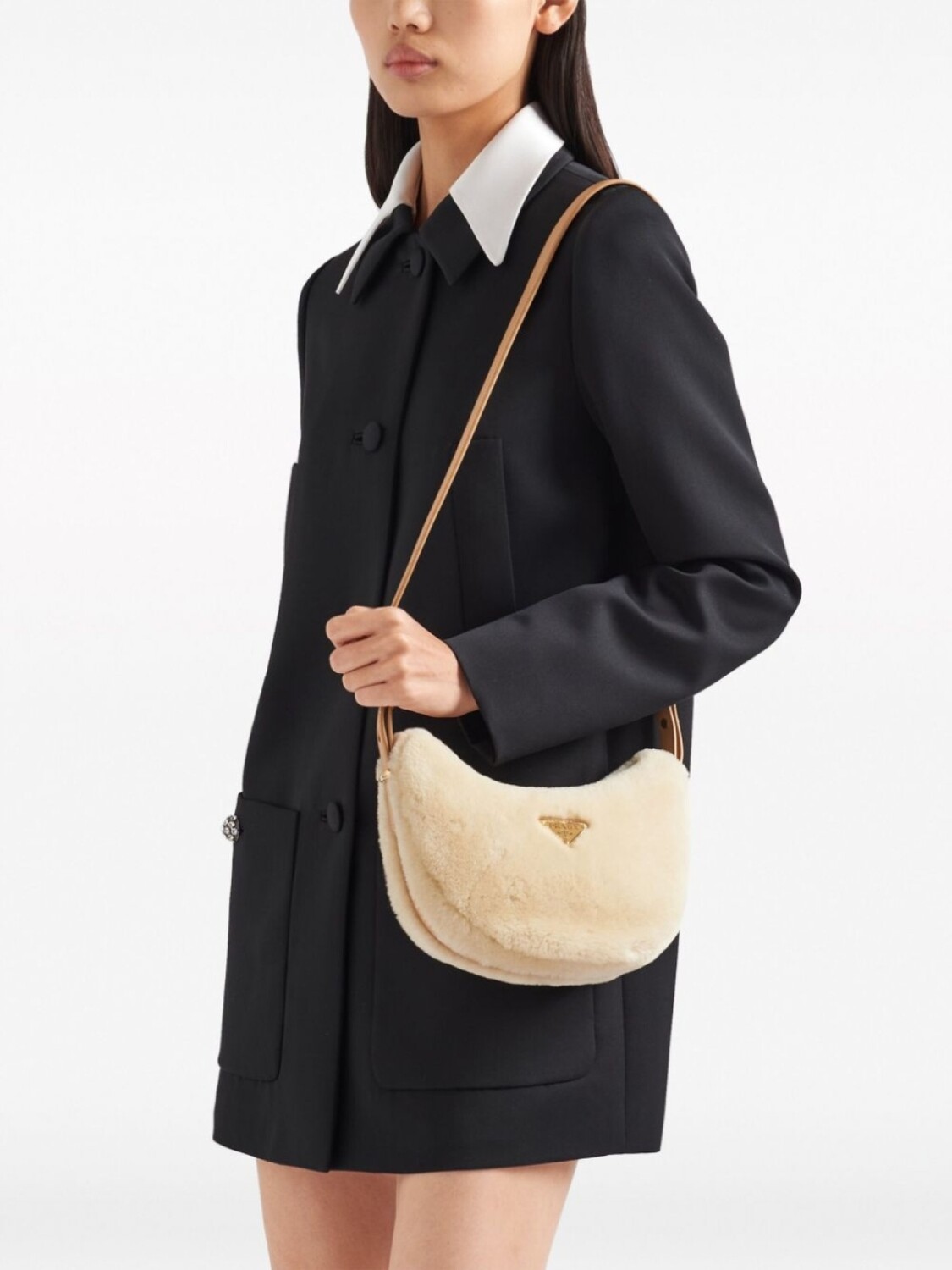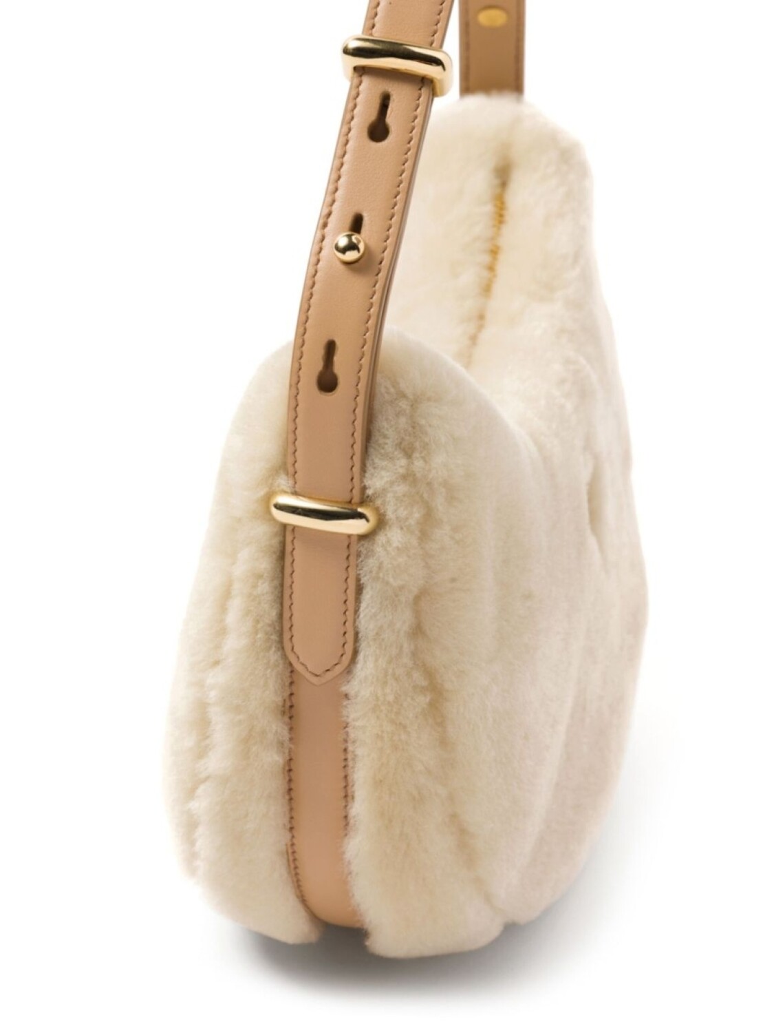 Кремово-белый, расцветка Light Brown, овечья кожа, овчина, кожаная отделка, треугольный эмалированный логотип, золотистая фурнитура, регулируемая ручка, застежка на молнии сверху, основное отделение и внутренний прорезной карман.