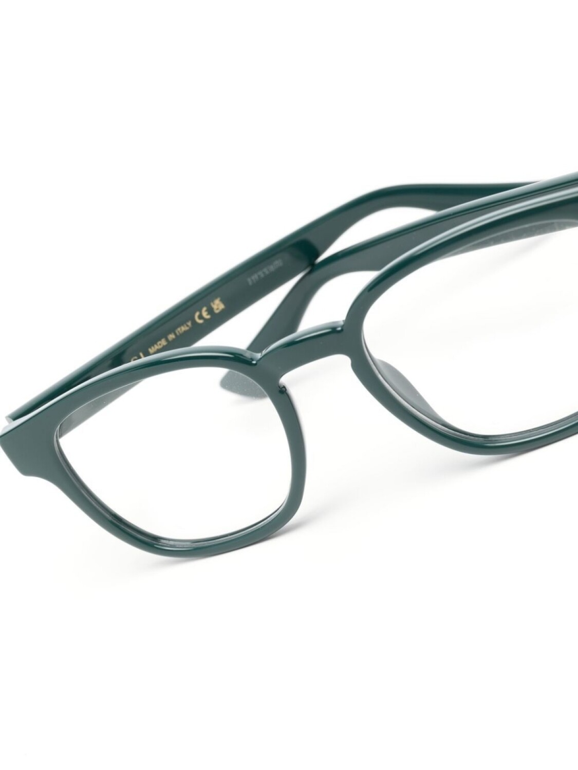 Темно-зеленый, ацетат, золотистый логотип, круглая оправа, прозрачные линзы, прямые дужки и дужки с закругленными концами. В комплект входит защитный чехол для очков. Обратите внимание, что на FARFETCH продаются оправы с линзами без диоптрий.