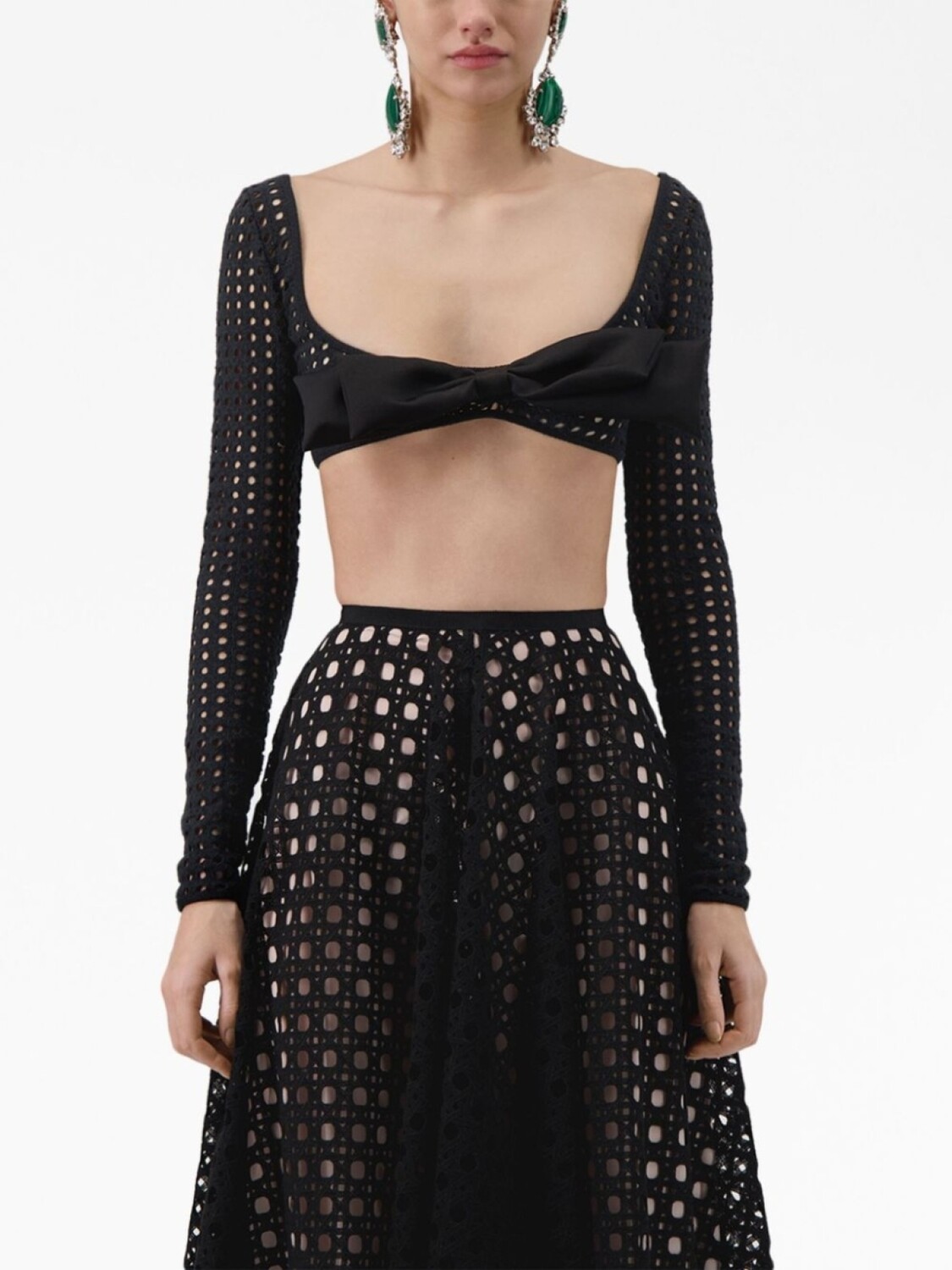 Черный, шелк, кроше, бант, глубокий U-образный вырез, длинные рукава и укороченная длина.