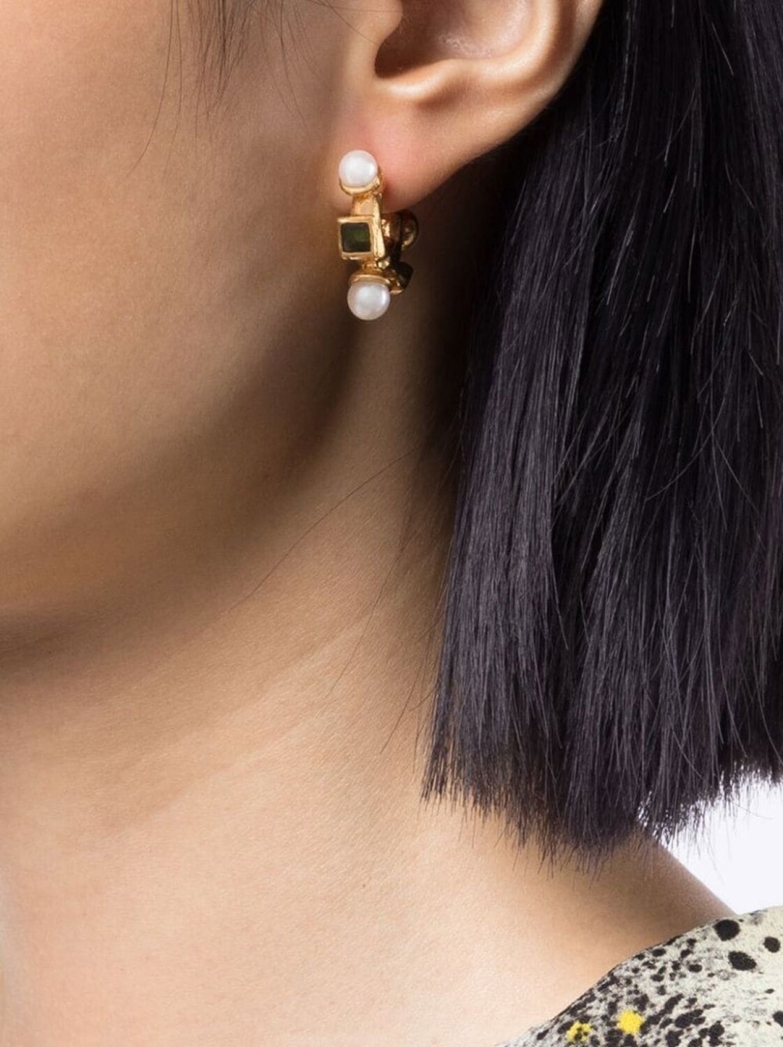 Покрытие из золота, жемчужная деталь, заклепки, полукруглая форма и для проколотых ушей. В комплект входят две серьги. .